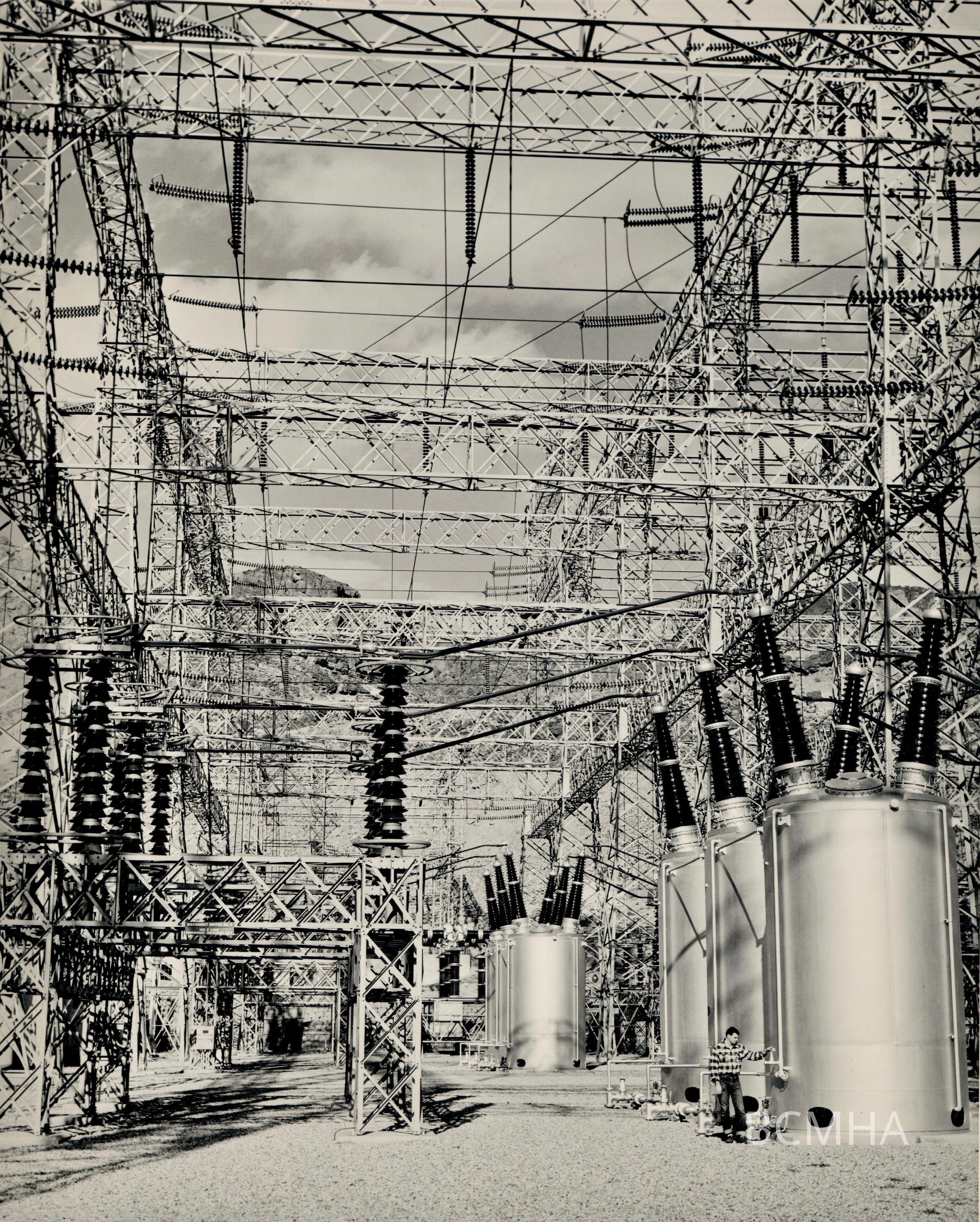 Hoover Dam power generation: Switchyard and Transformers, c. 1940s-50s; USBR photo/BCP 7642Collection