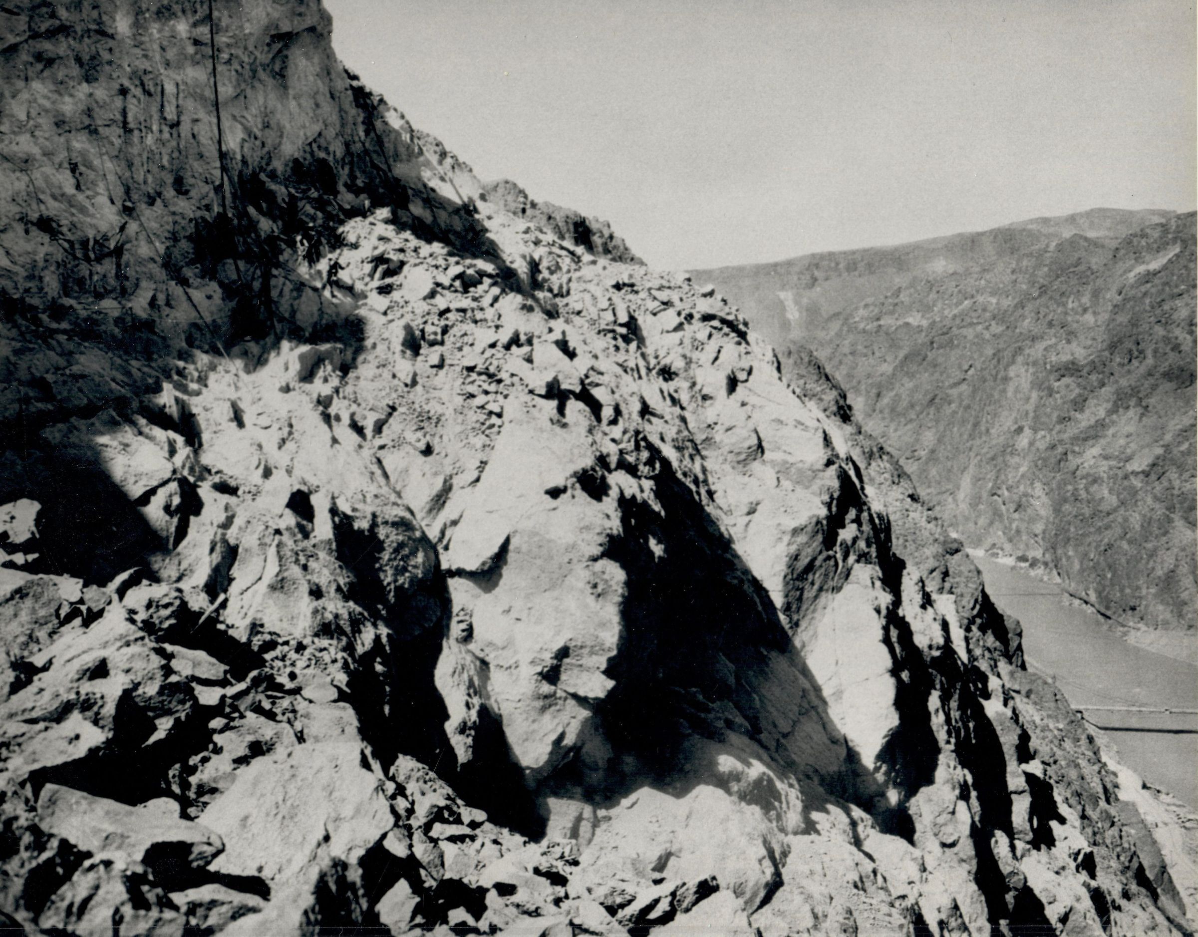 Hoover Dam roads: U. S. 93 [aka Black Canyon Highway]: "This picture was taken at the Nevada abutment of the dam. Workmen are drilling for the extension of the highway from the damsite to the Nevada spillway. The boom of a shovel is shown working in from the opposite direction." 7-26-32; W. A. Betchel Collection Photo #1394 - Volume Two; Roll 23 - Photo No. 8 - Copy Negative - Bureau of ReclamationCollection