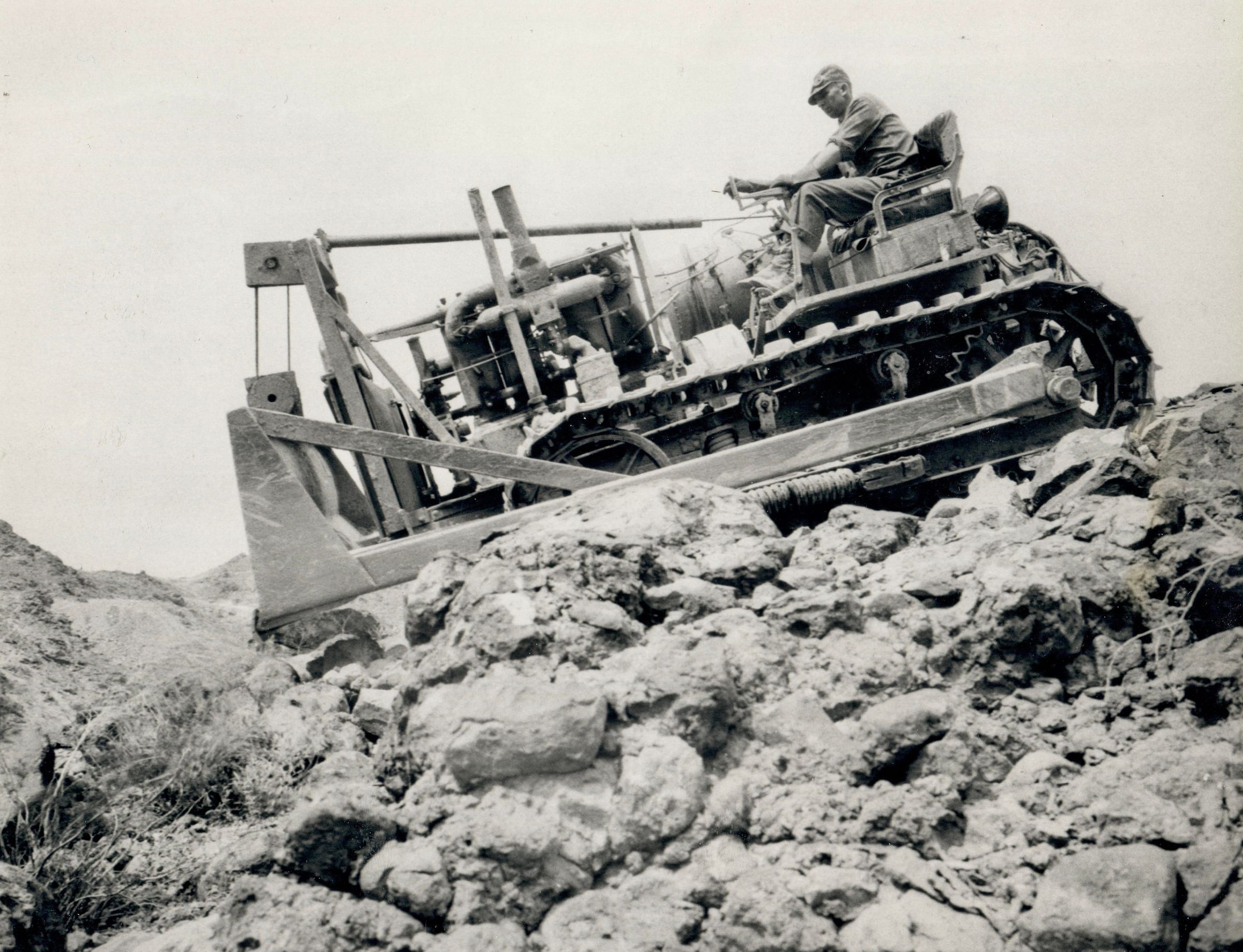 Hoover Dam - roads: U. S. 93 [aka Black Canyon Highway]: "Caterpillar tractors, equipped with bulldozers, perform a multitude of tasks in connection with road building and the removal of blasted rock." 3-28-32; W. A. Bechtel Collection; Photo #1062 - Volume Two; Roll 18 - Photo No. 2 Copy Negative - Bureau of ReclamationCollection