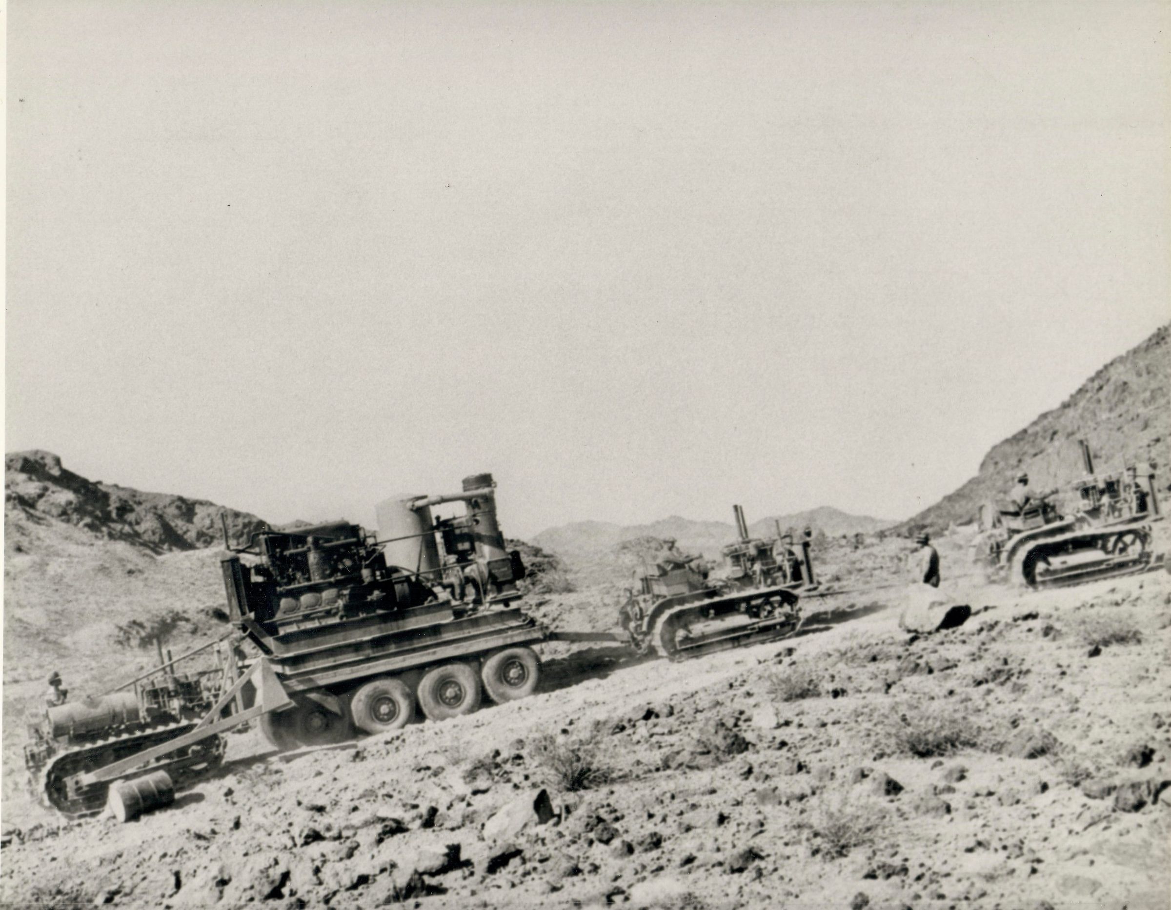 Hoover Dam roads: U. S. 93 [aka Black Canyon Highway]: "Graphic Views of Hoover Dam Caterpillars hauling a 25-ton air compressor up a 25% grade during construction of Government (Black Canyon) Highway." Circa May, June 1931; Photo #40 by W. A. Davis; Roll 9 - Photo No. 6 - Copy Negative - Bureau of ReclamationCollection