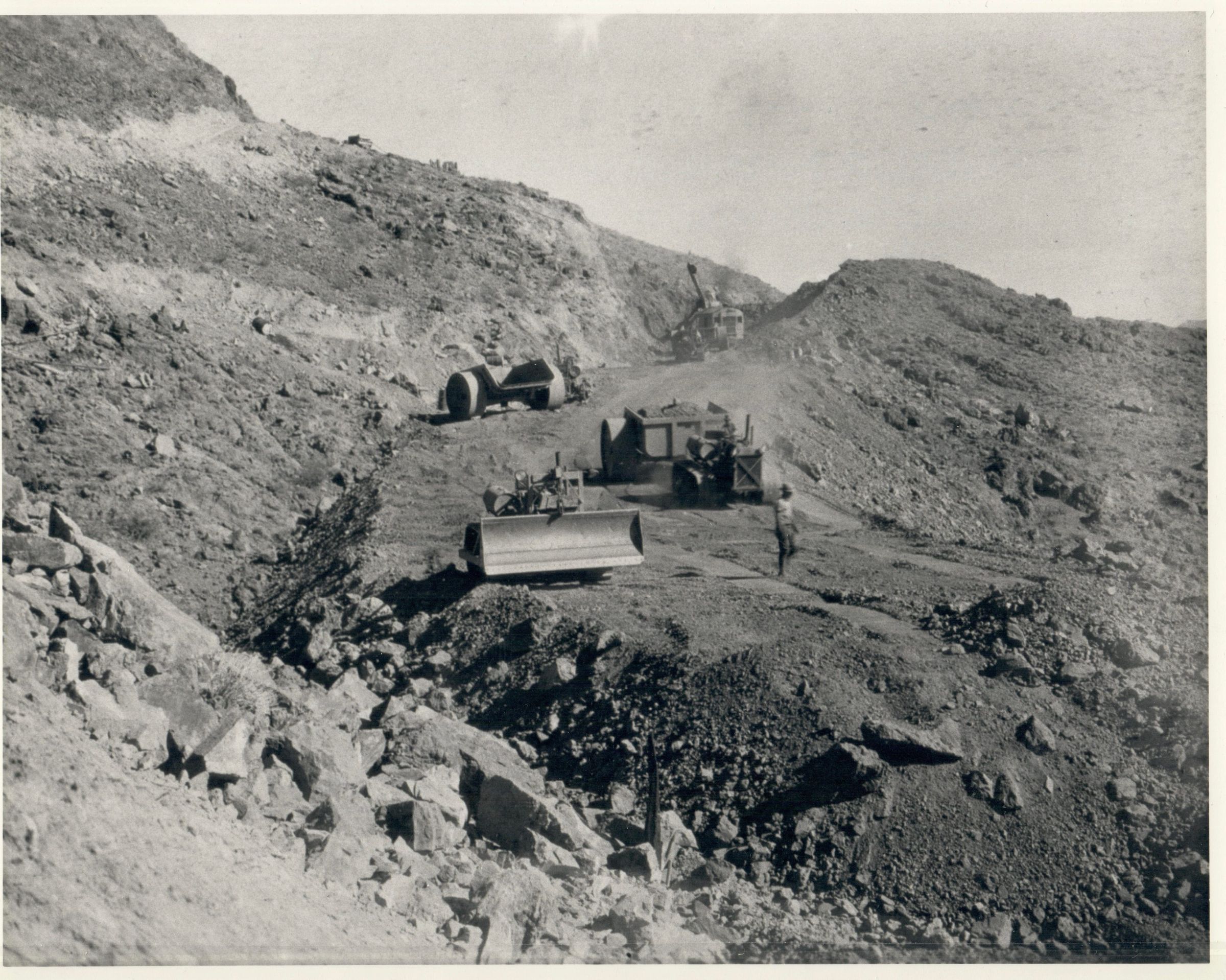 Hoover Dam roads: U. S. 93 [aka Black Canyon Highway]: "Rock cut on U.S. Construction Highway, Le Tourneau, subcontractor. Equipment: 2 1/2 c.y.; Bucyrus 50 B Shovel; three 60hp caterpillars with 16 yd. carts; one 60 hp caterpillar with bulldozer." February 25, 1931; O. G. Patch, photographer; USBR photo Wash. No. 603/Temp. No. 220Collection