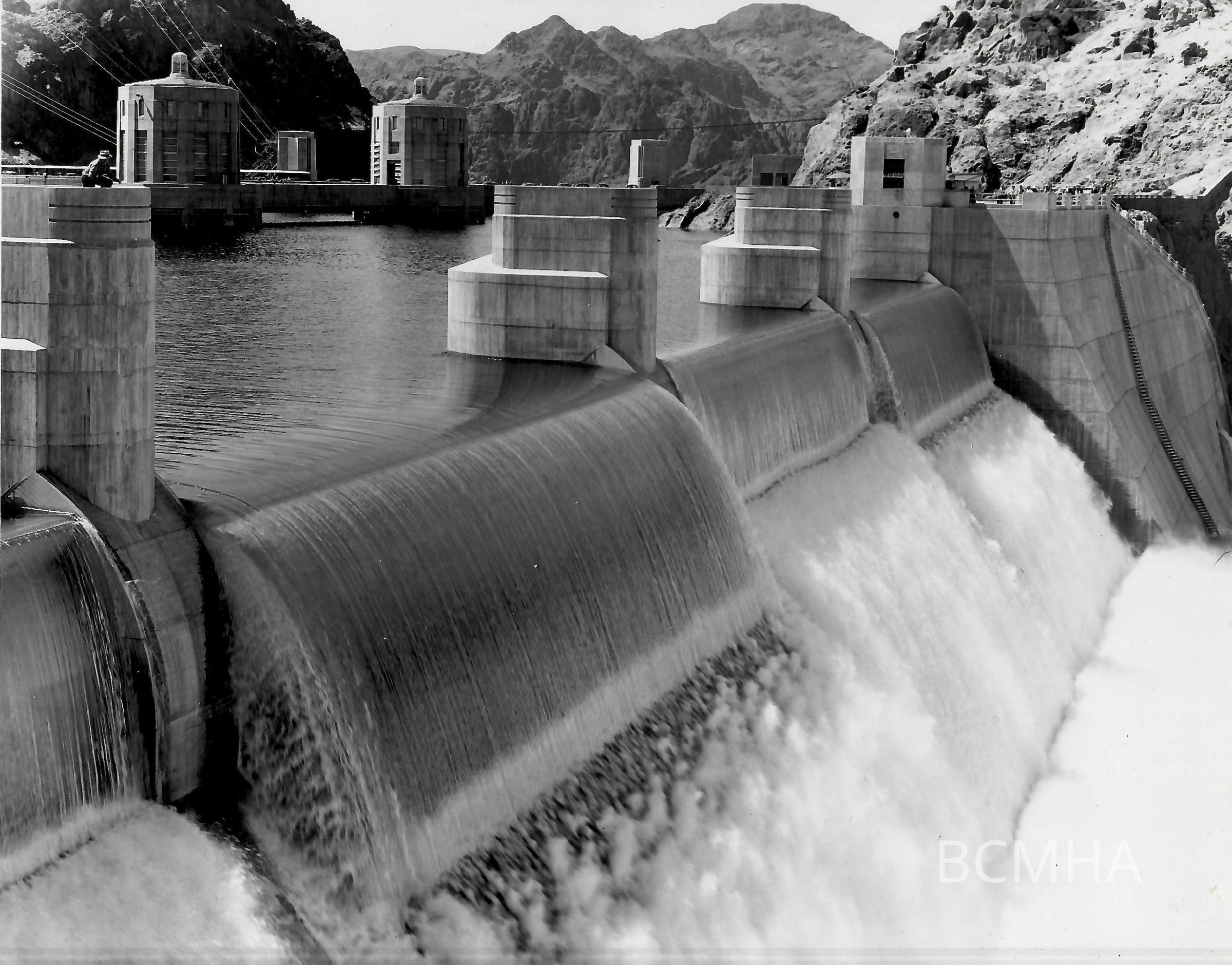 Hoover Dam spillways: Nevada, August 18, 1941; "A view of Nevada spillway, with Lake Mead flowing over four drum gates. The one next to the camera is in the process of being lowered."; USBR photo no. BCP 05471; Cliff Segerblom, photographerCollection