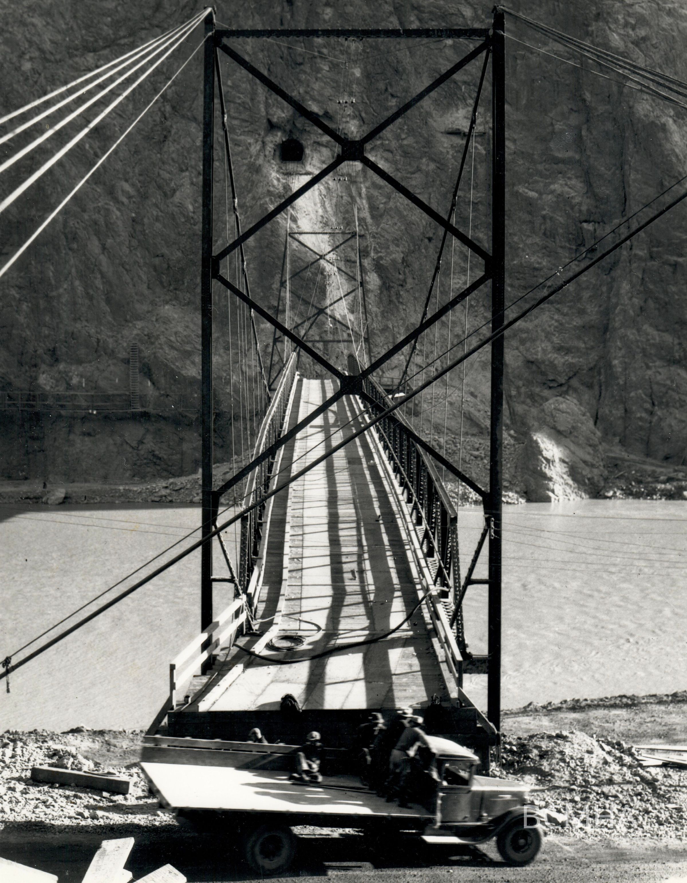Hoover Dam - "Steel Suspension bridge erected by Six Companies, Inc., immediately upstream from diversion tunnel inlets in Black Canyon. View from Nevada anchorage." January 15, 1932; Ben D. Glaha, photographer; USBR photo P45-301-1011 NACollection
