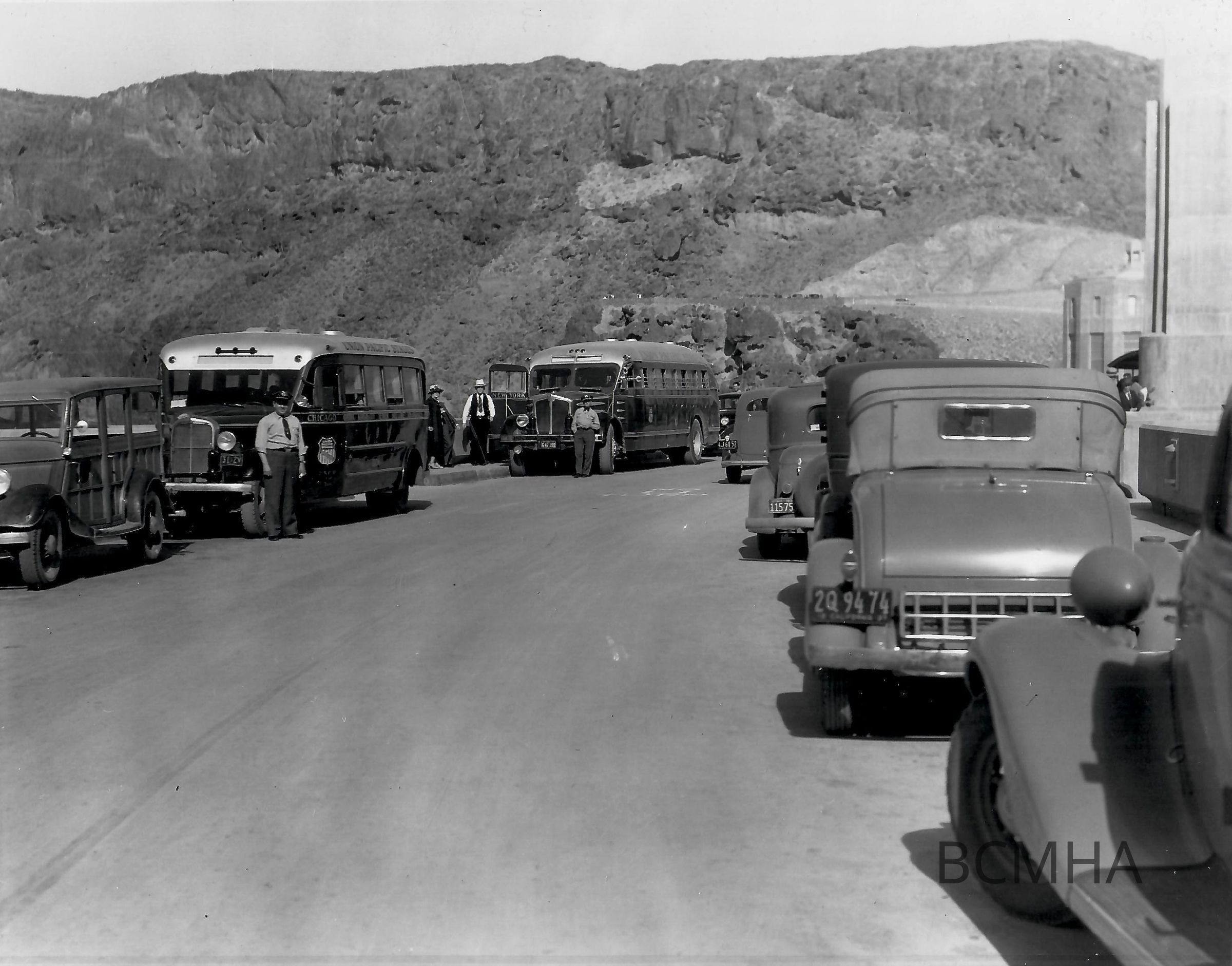 Hoover Dam tourists and tourism: "Union Pacific buses on top of Hoover Dam. Union Pacific bused make two complete trips to the dam each day, one in the morning and another in the afternoon. May 30, 1937"; Water and Power Resources Service photo by R. B. Spearman; U. S. Department of the Interior Bureau of Reclamation photo P45-301-3909Collection