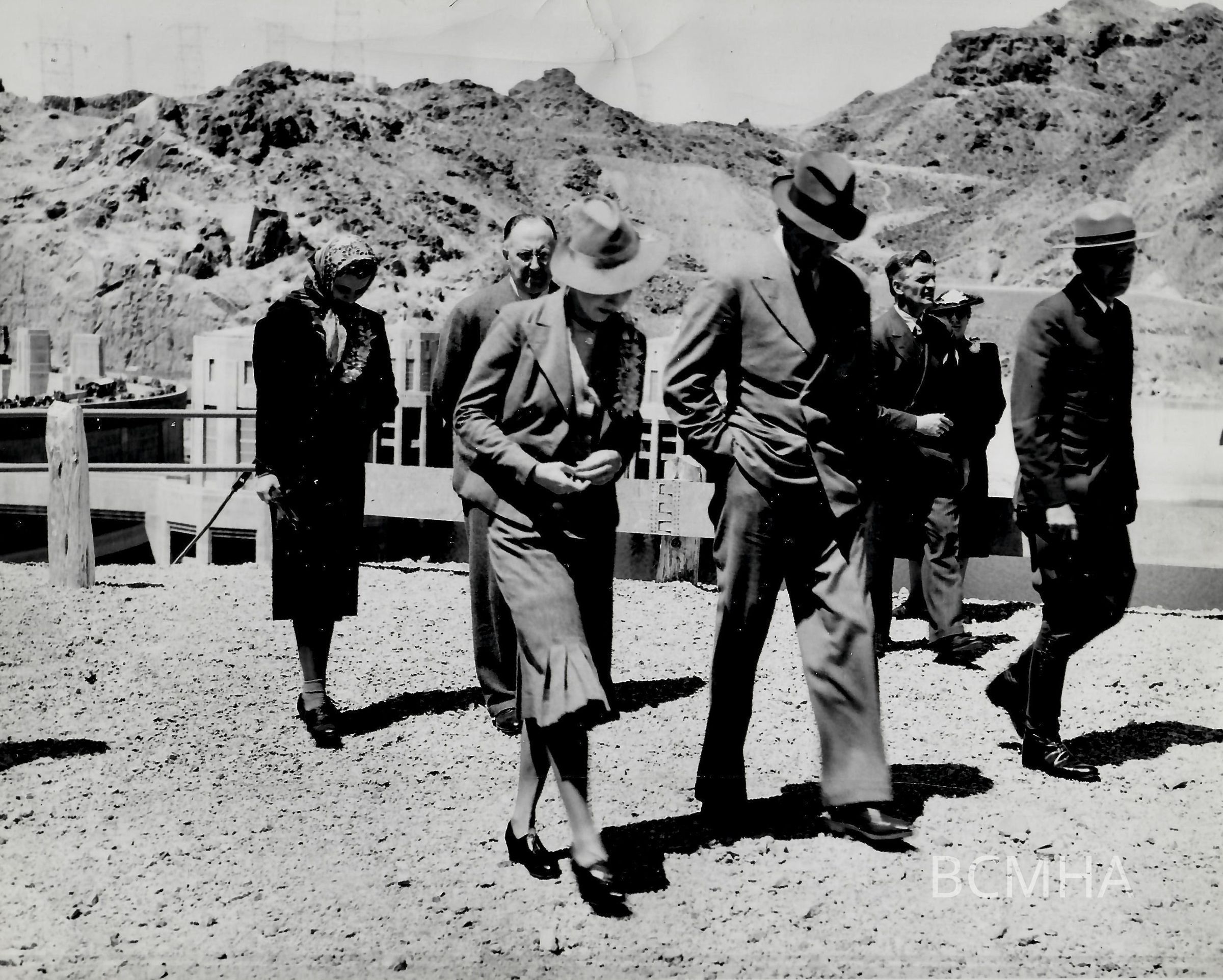 Hoover Dam tourists and tourism: Crown Princess Ingrid [pleats] and Crown Prince Frederick [hand in pocket] at Hoover Dam, April 15, 1939; G. Lawrence Ullom, photographerCollection