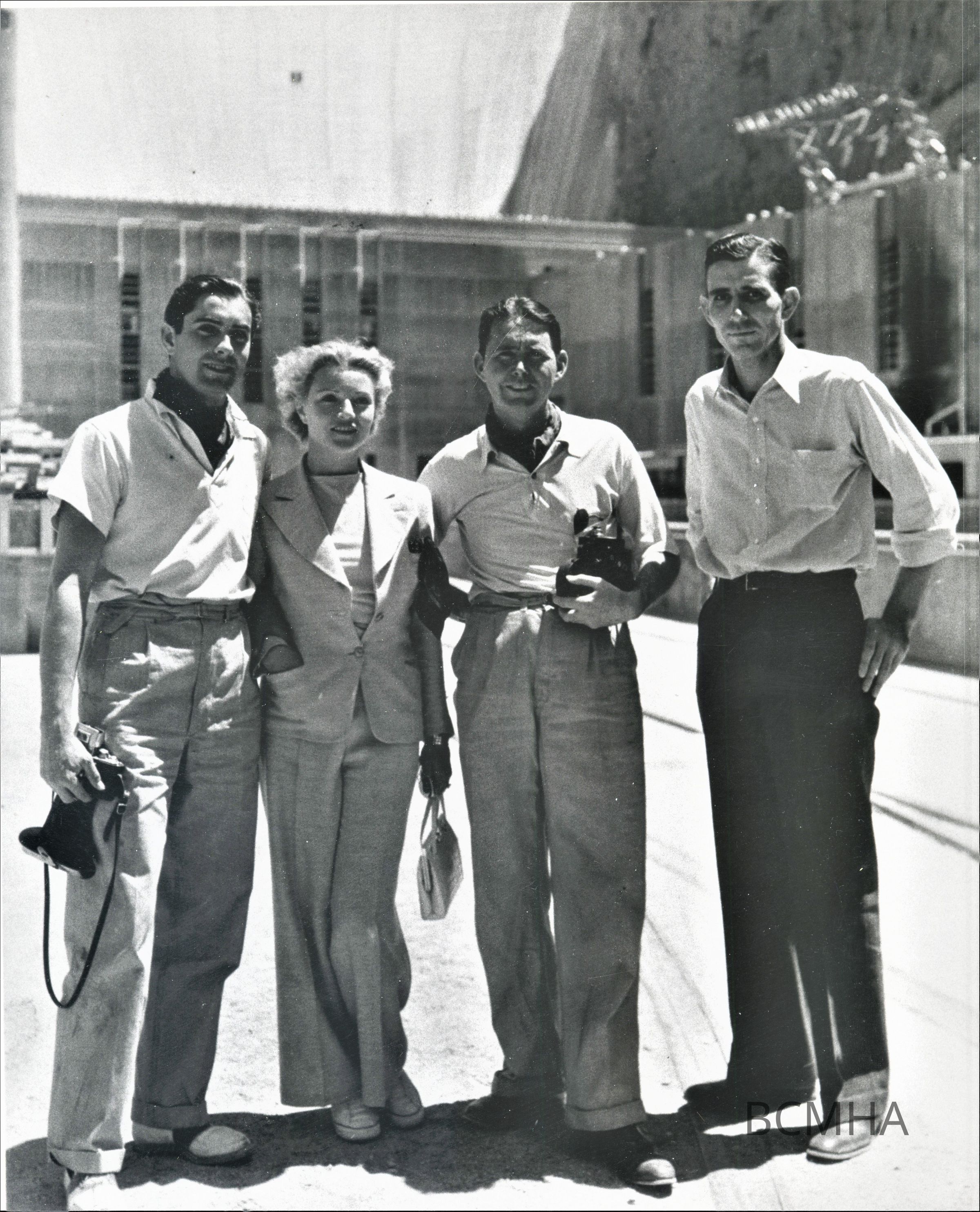 Hoover Dam- tourists and tourism: l-r: Tyrone Power; his wife, Annabella; M. McKeen [Thompson Trophy pilot who flew the couple to Boulder City]; and Rupert B. Spearman, who conducted the party through the powerhouse, May 26, 1939; USBR photo no. 4677; Cliff Segerblom, photographerCollection