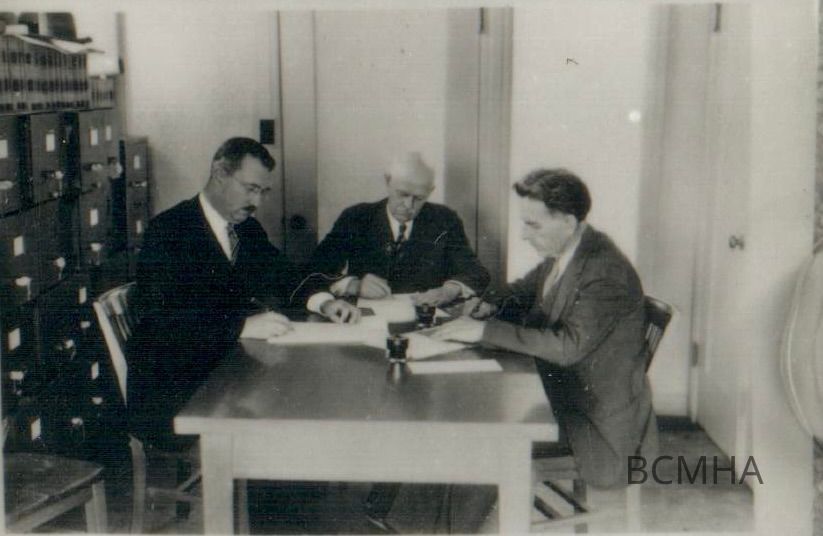 Hoover Dam unidentified contract signing, c. April 1931; l-r: unidentified; unidentified; Wilbur Mills(?); 0123 0168 folder 123 Ray Cutright Collection; UNLV Library - Special Collections Copy Negative; USBR photoCollection