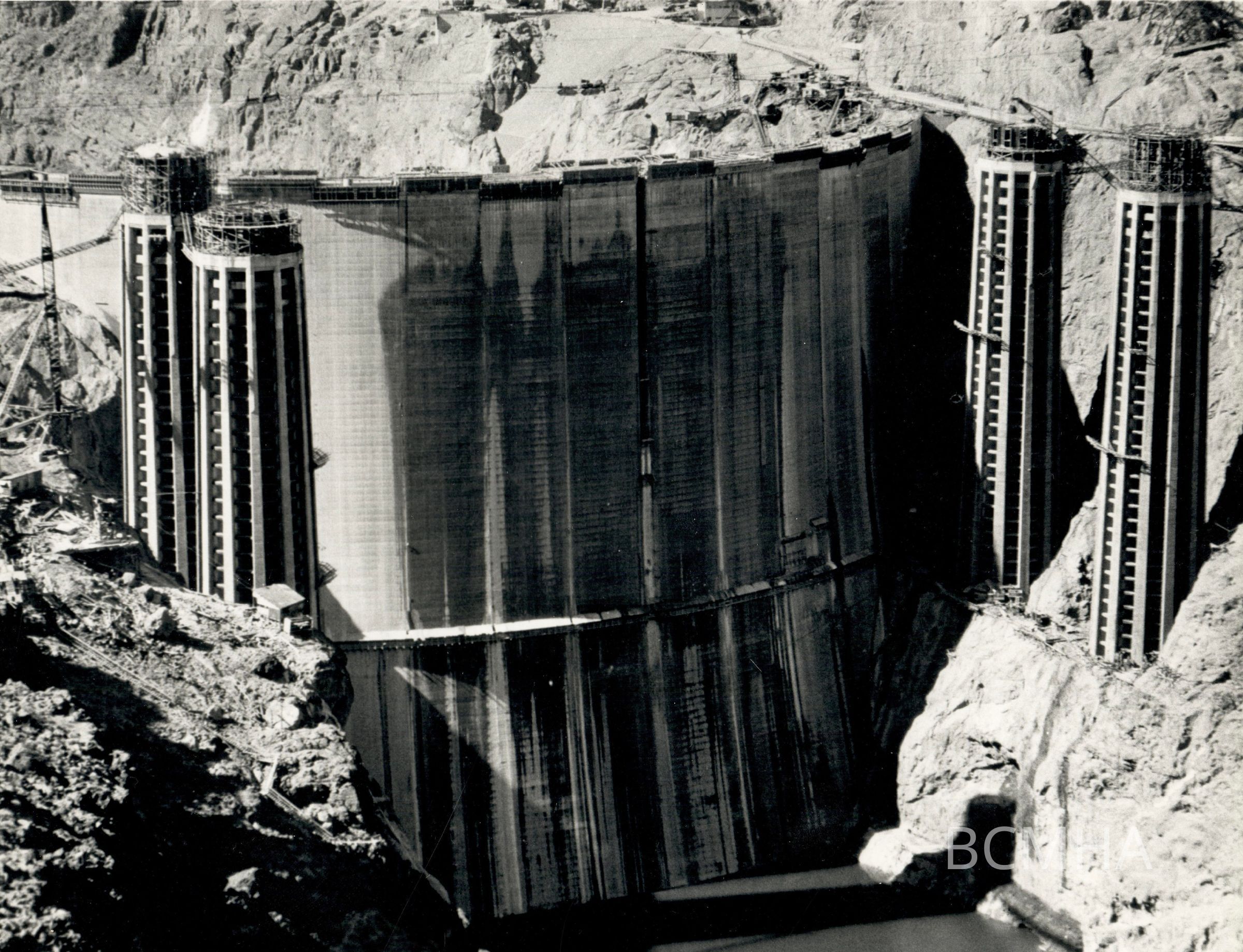 Hoover Dam "Upstream face of the dam and intake towers as seen from high point upstream on Arizona rim of Black Canyon." February 27, 1935; B. D. Glaha, photographer; USBR photo Wash. No. 2921/Temp. No. 2402Collection