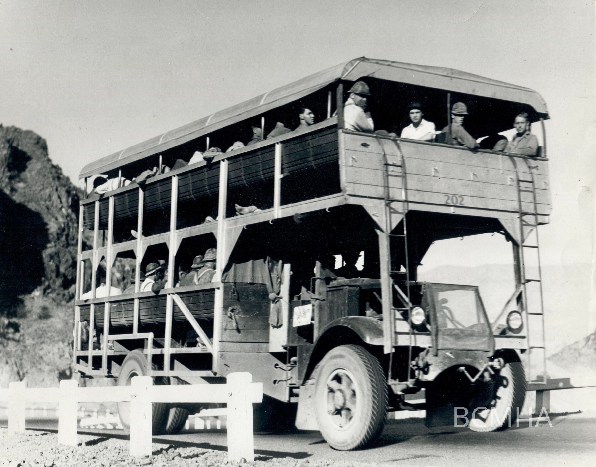 Hoover Dam workers: transportation: "Big Bertha" Motor transport used to move men to and from the damsite. April 12, 1934; B. D. Glaha, photographer; USBR photo/BCP 02394 (?)Collection