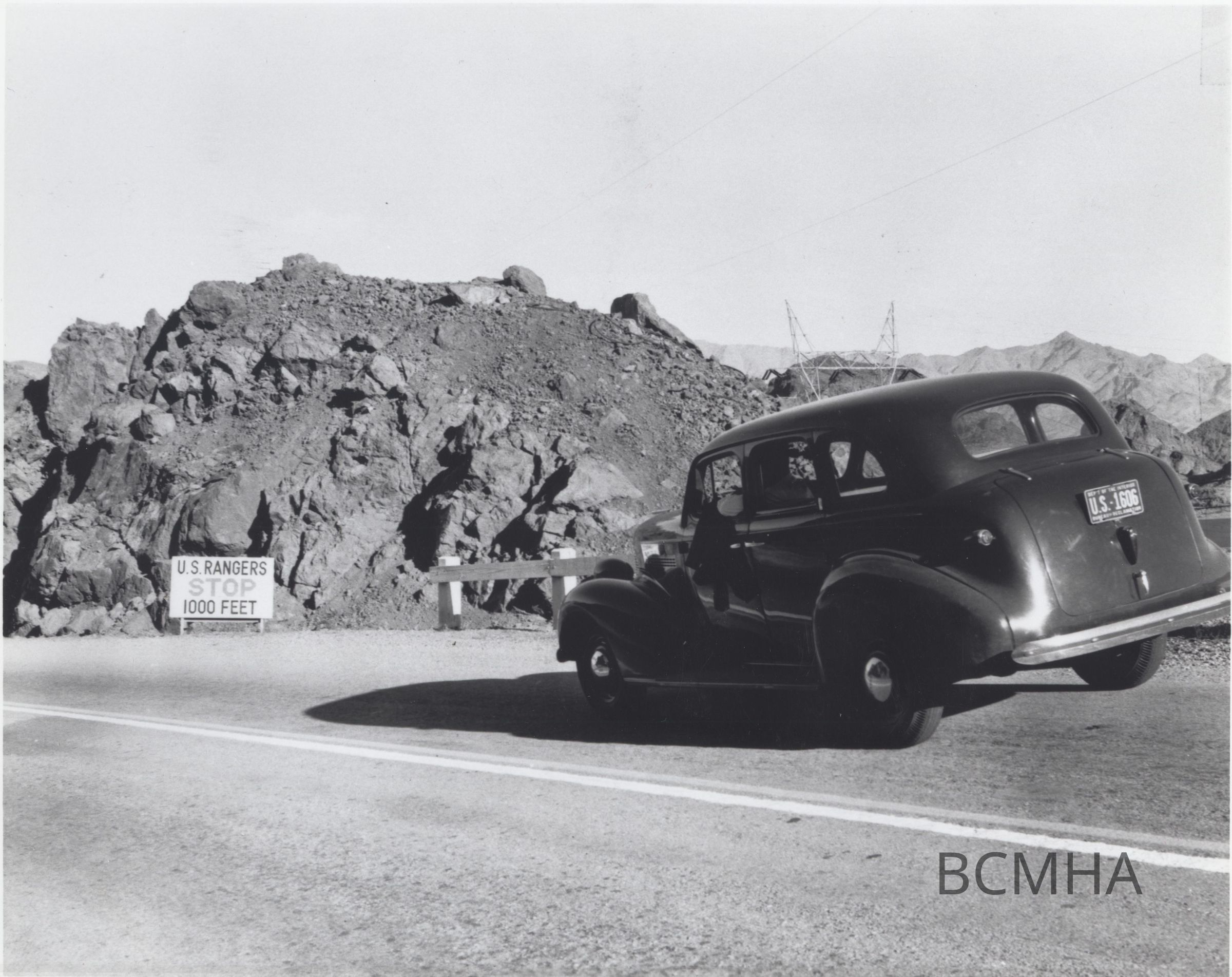Hoover Dam- World War II security: "When the traveler or tourist approaches Boulder Dam, he is confronted with a sign such as in the photo". January 28, 1942 [unidentified person shown] ; USBR photo no. 5537; William S. "Bill" Russell, photographerCollection