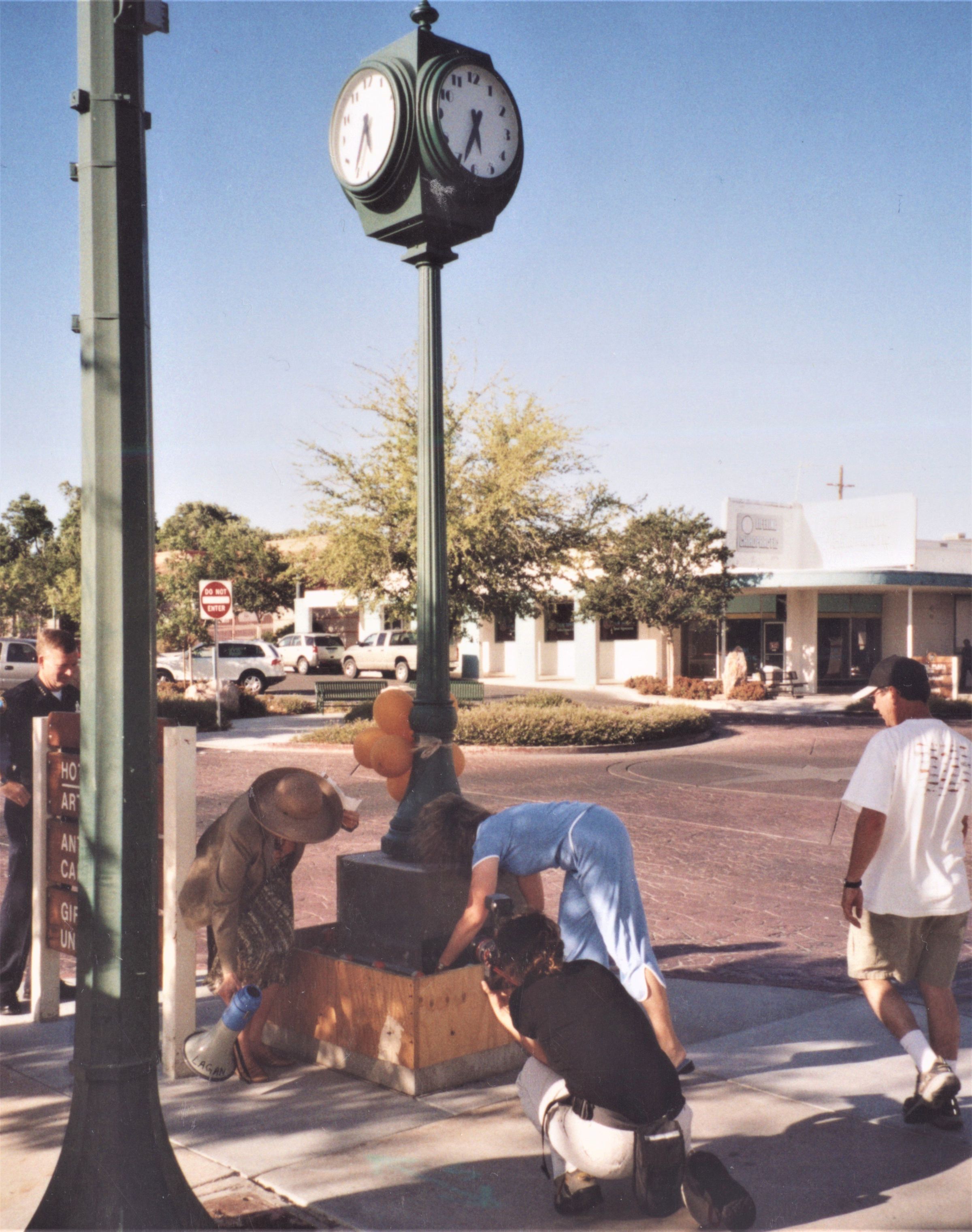 Hotel Plaza clock dedication May 19, 2006; placing the time capsule in the base of the clock; Sharon Heher megaphone; holder; Jill Lagan; Chamber of Commerce executive director with the time capsule; Dennis McBride, photographerCollection