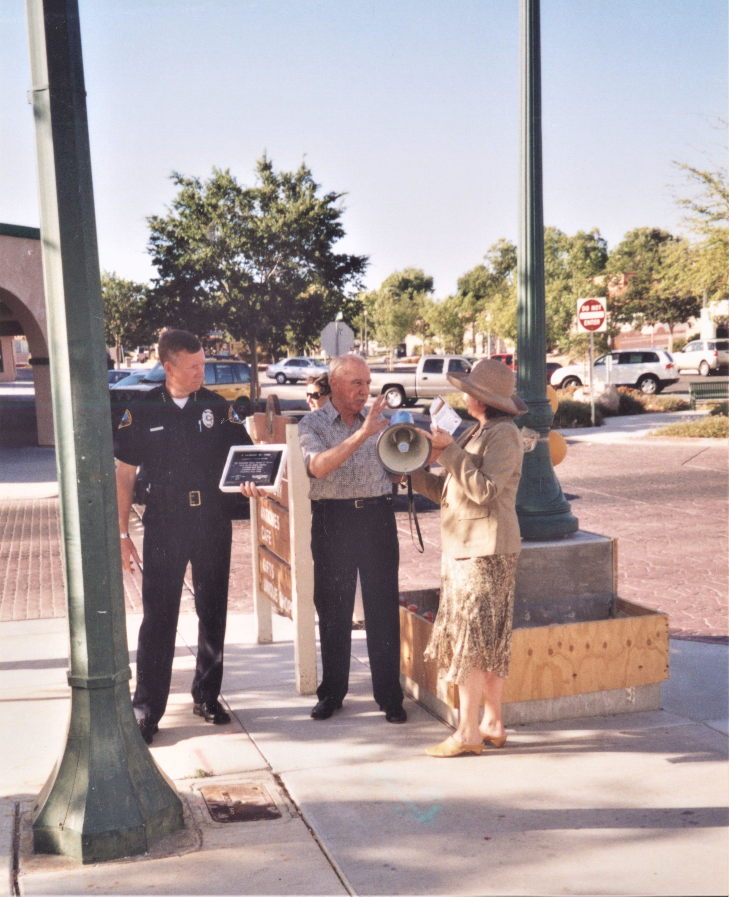 Hotel Plaza clock dedication May 19, 2006; l-r: Tom Finn, police chief; Robert “Bob” Ferraro, mayor; Sharon Heher; Dennis McBride, photographerCollection