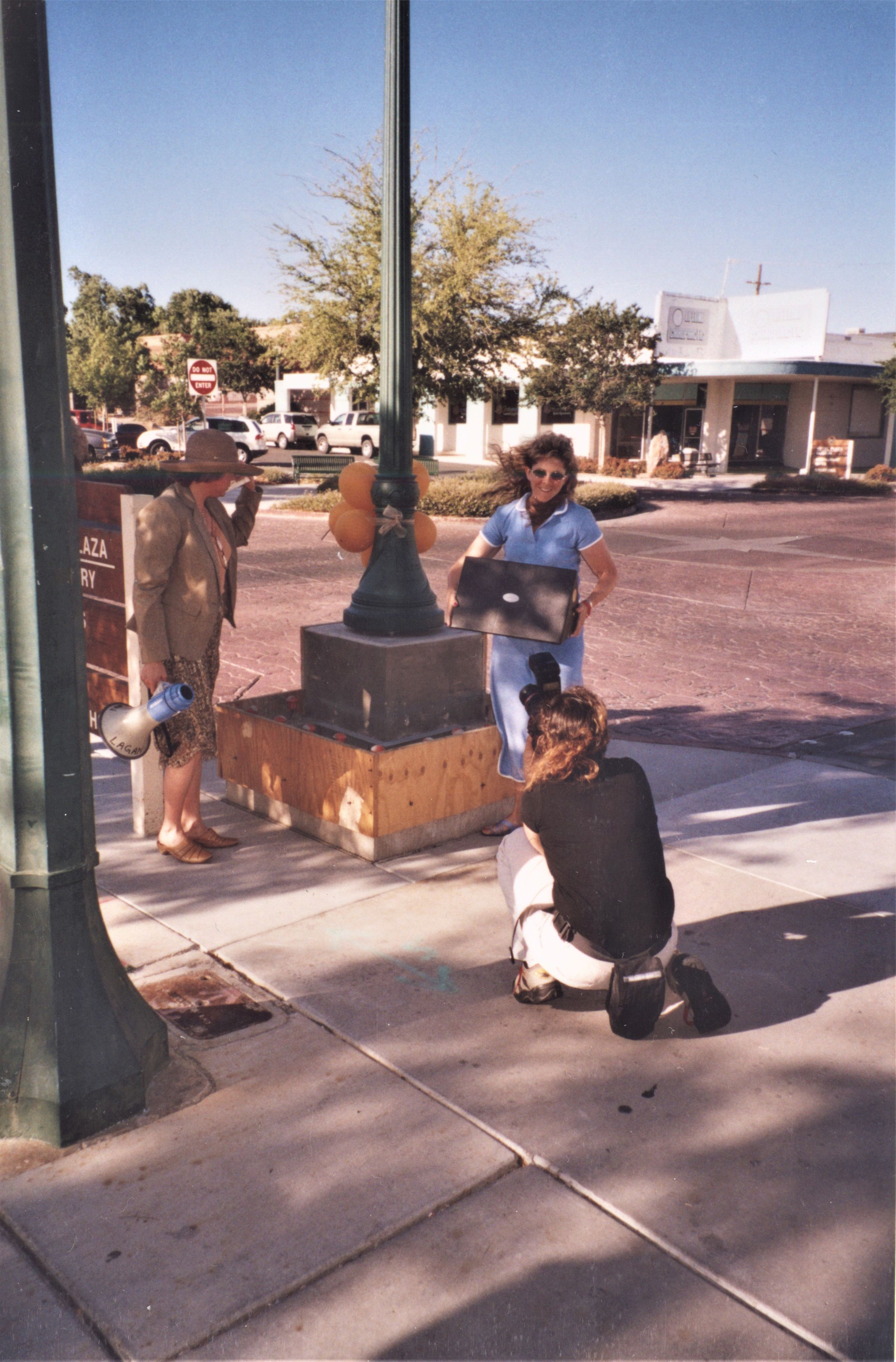 Hotel Plaza clock dedication May 19, 2006; placing the time capsule in the base of the clock; Sharon Heher, megaphone; holder Jill Lagan; Chamber of Commerce executive director with the time capsule; Dennis McBride, photographerCollection