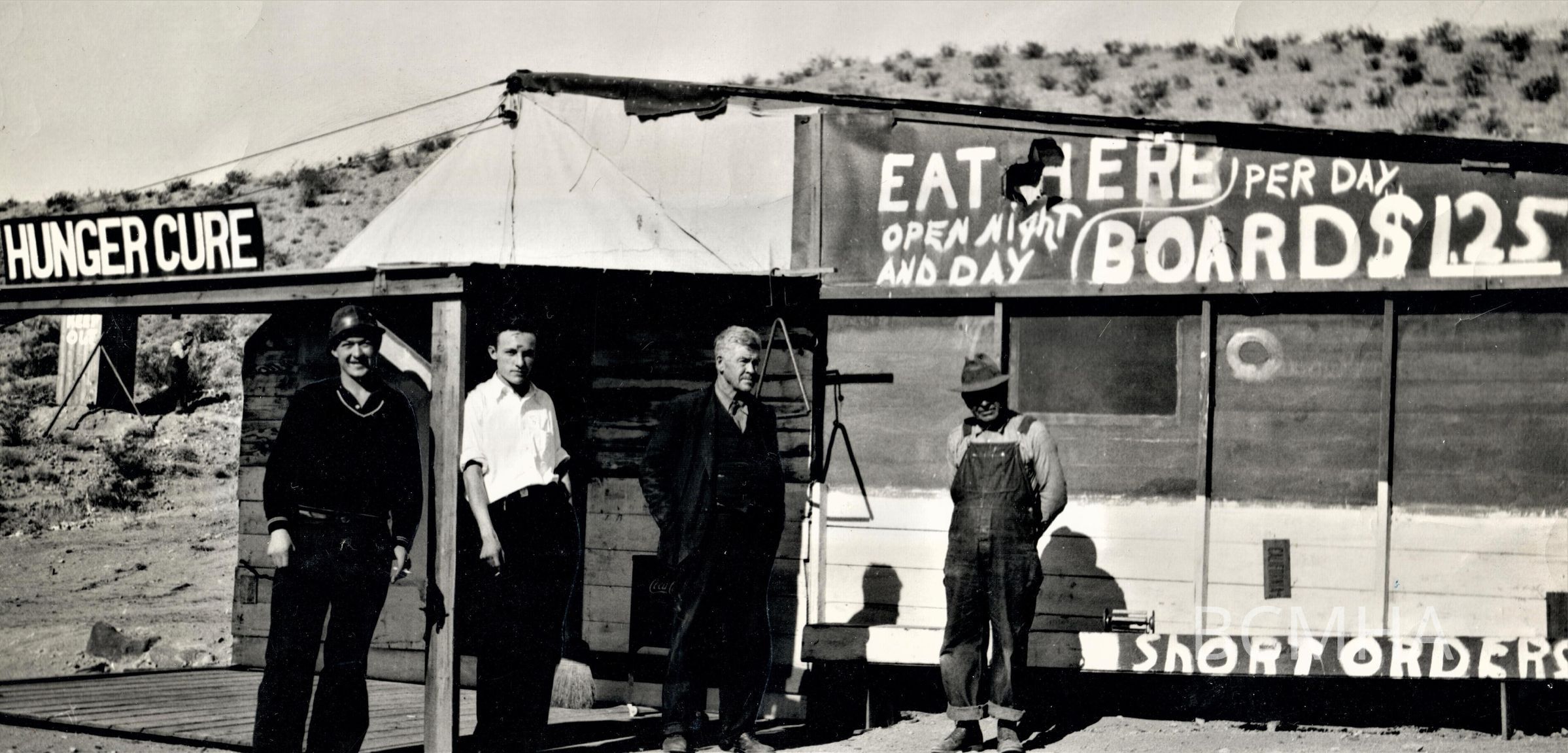 Hunger Cure Restaurant, c. 1932 [unidentified men; note outhouse; the café was located at the bottom of Colorado Street, facing the street.]