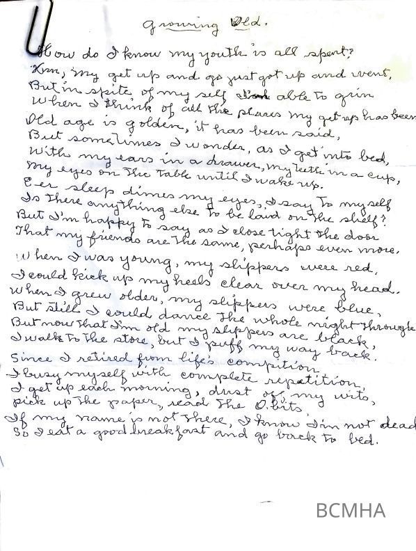 This file contains: newspaper articles; handwritten poem called Growing Old; handwritten notesCataloged By