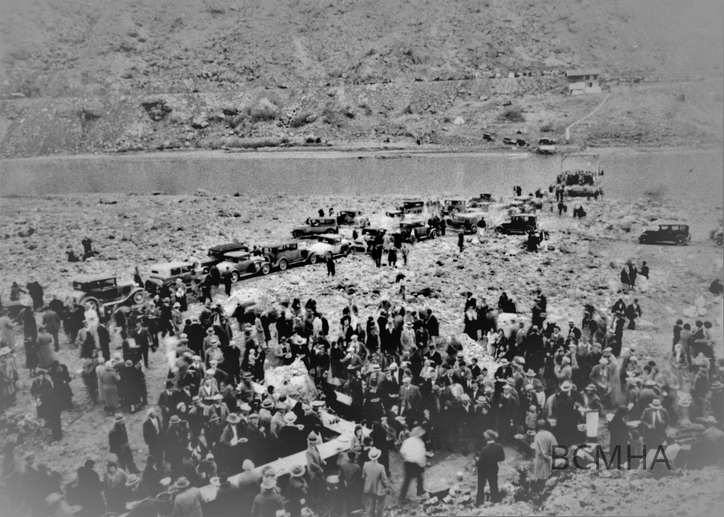 Roads and streets; Kingman Highway; dedication ceremonies; on the Arizona; side of the Colorado River; December 3, 1931; note the Hoover Dam; Terminal; on the Nevada; side of the river for the ferry; event celebrated with barbecue; Boulder City Library; "Graphic Views of Hoover Dam,"; Winthrop A. Davis, photographerCollection