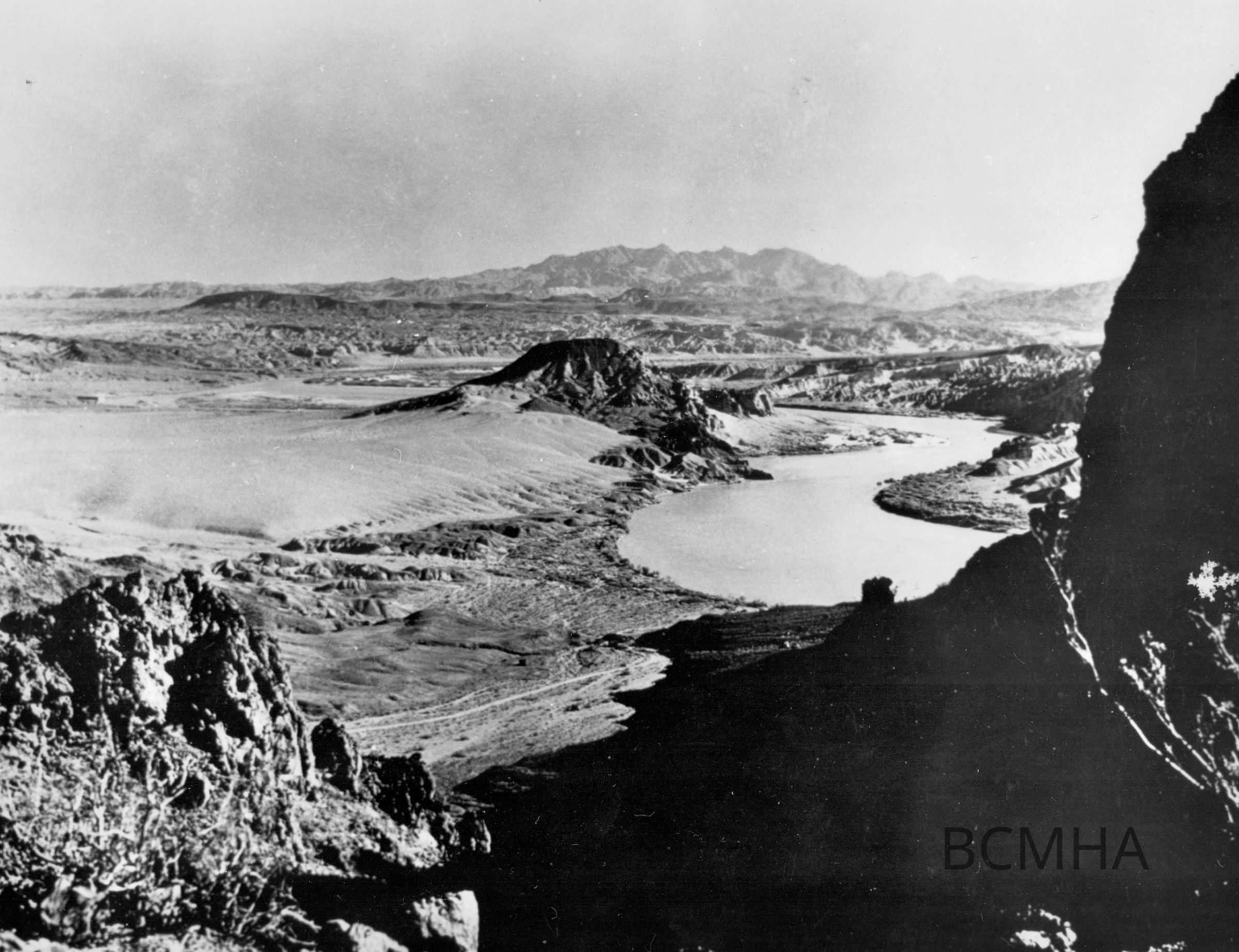 Lake Mead future bed, c. 1929-1933 "Black Canyon Reservoir site from Monument Pass on the Nevada side of river."; Photograph taken at 6:25 a.m. 7/23/29, Bureau photo by J. E. Stimson; USBR photo/BCP 311ACollection