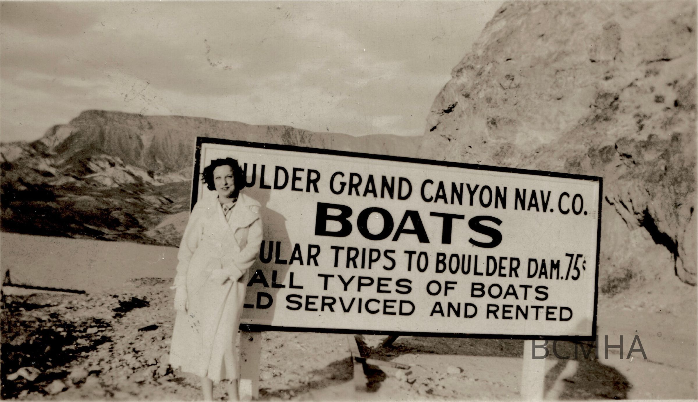 Lake Mead tourism, 1930's: Sign for the Boulder Grand Canyon Navigation Company, c. 1934 [unidentified woman]Collection