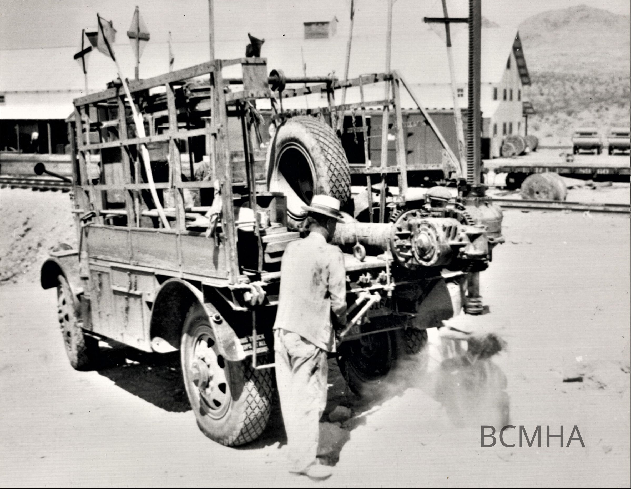 Boulder City roads & Streets; hole-boring machine; on Railroad Ave; Six Companies; warehouse in the background; 1931; UNLS; Cutright Collection; 0123:0045Made/Created