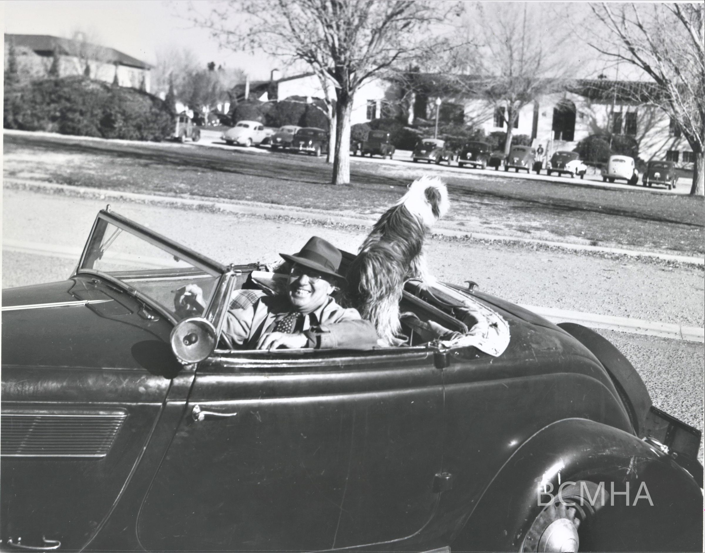 Mort Wagner designer of the Boulder Dam Hotel and his dog, Rags; December 1947; Bill Belknap Jr. photoCollection