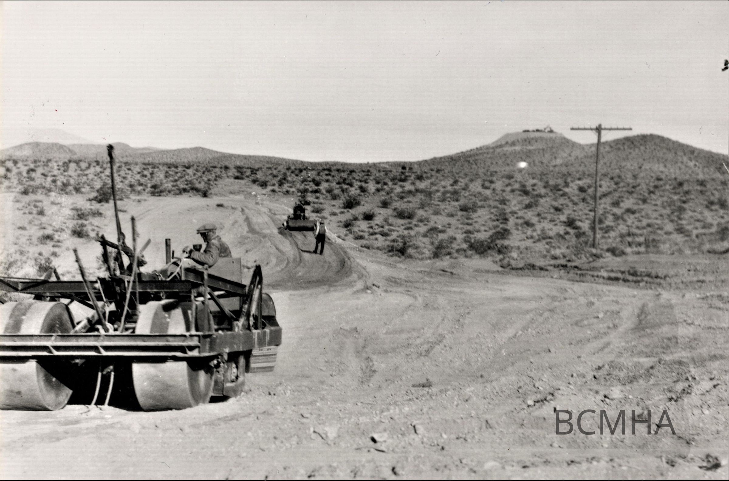 Boulder City; roads & Streets; NV. Hwy under construction; 1931; 2-million-gallon water tank; under construction on the hill in the left distanceMade/Created