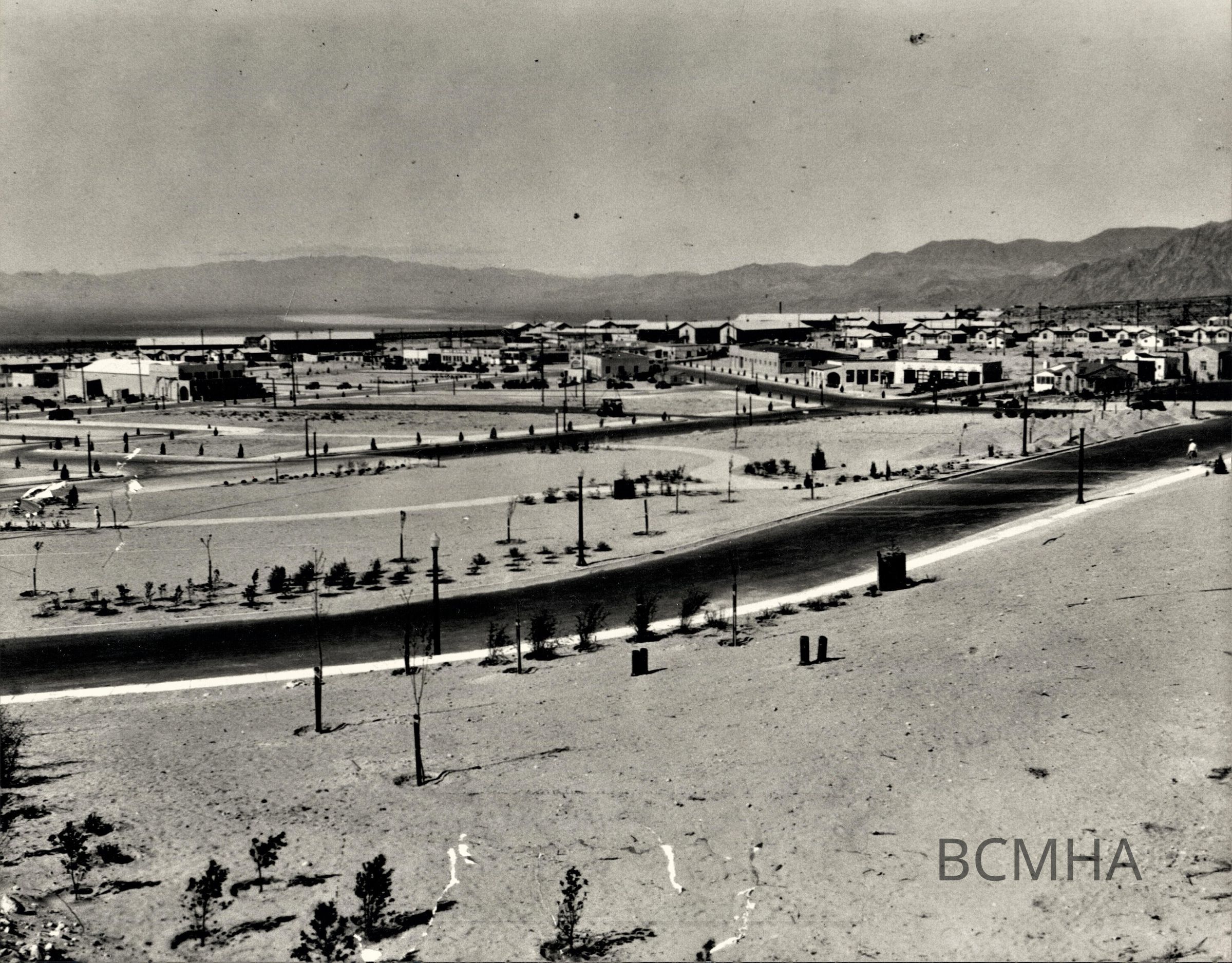 Panorama of Boulder City looking southwest from the Bureau of Reclamation Administration Building over Wilbur Square; Cardenas Plaza; site of the Boulder Dam Hotel, left of center, west of the Boulder Theater; May 2, 1932; USBR Photo, Wash. No. 1260; G.A. Beyer, photographerLexicon
