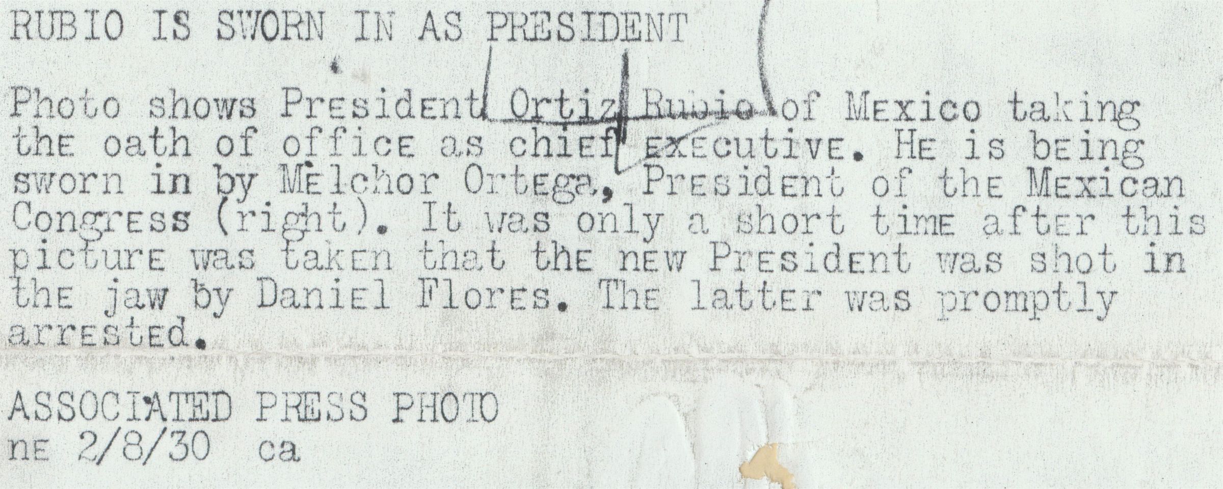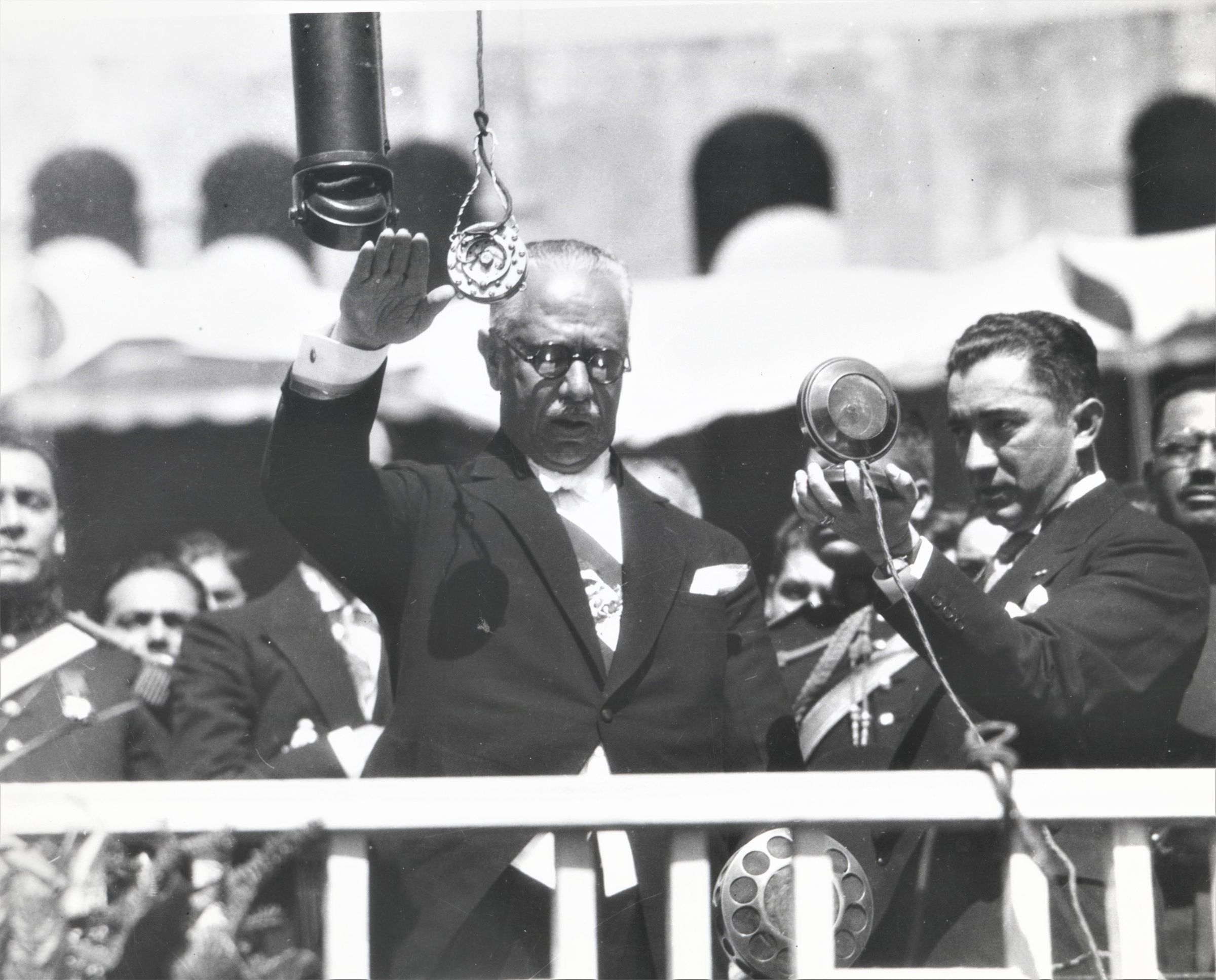 Pascual Ortiz de Rubio being sworn in as President of Mexico by Melchor Ortega; President of the Mexican Congress holding the microphone February 8, 1930; It was only a short time after this picture was taken that Mexico's new president was shot in the jaw by Daniel Flores promptly arrested; World Wide PhotoCollection