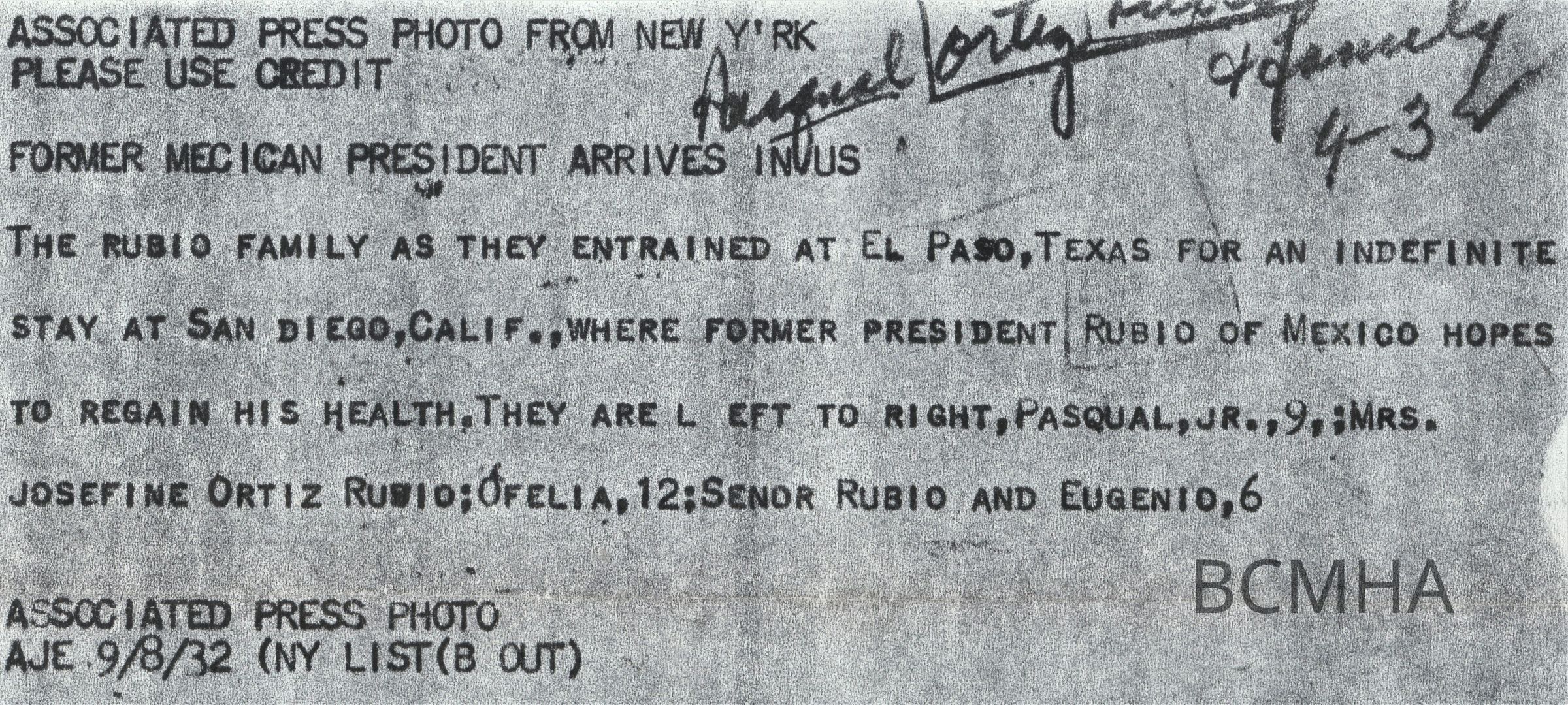 Pascual Ortiz de Rubio fleeing Mexico through El Paso 5 days after resigning the Presidency of Mexico, September 8, 1932; from left to right: Pascualo Jr. 9; Josefine Ortiz de Rubio; Ofelia 12; Pascual Ortiz de Rubio; Eugenio 6; World Wide photosCollection