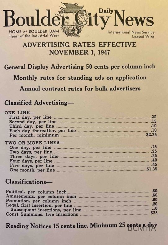 This file contains: newspaper articles; newspaper clippings; business cards; advertising materials; hand-written lists; contracts; letters; printed list of Nevada newspapers in 1952; hand-written children's letters; letterheads; certificate; photocopies of newspaper articles; newspaper article with poem; hand-typed essay - History of Newspapers in Boulder City by Rob BegleyCataloged By