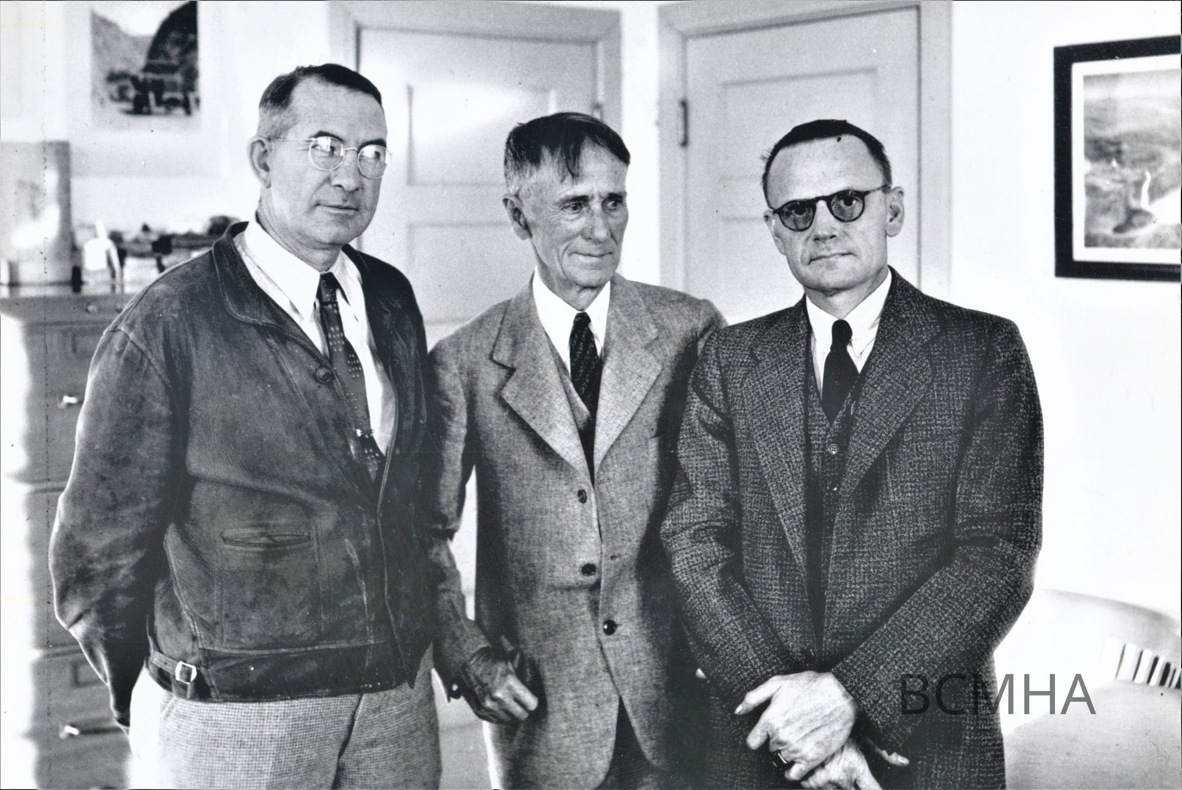 Ralph Lowry, Chief Field Engineer; Sims Ely, Boulder City manager; Walker R. Young, Boulder Canyon Project construction engineer- together on the occasion of Walker Young's departure for the Central Valley Project, CA.