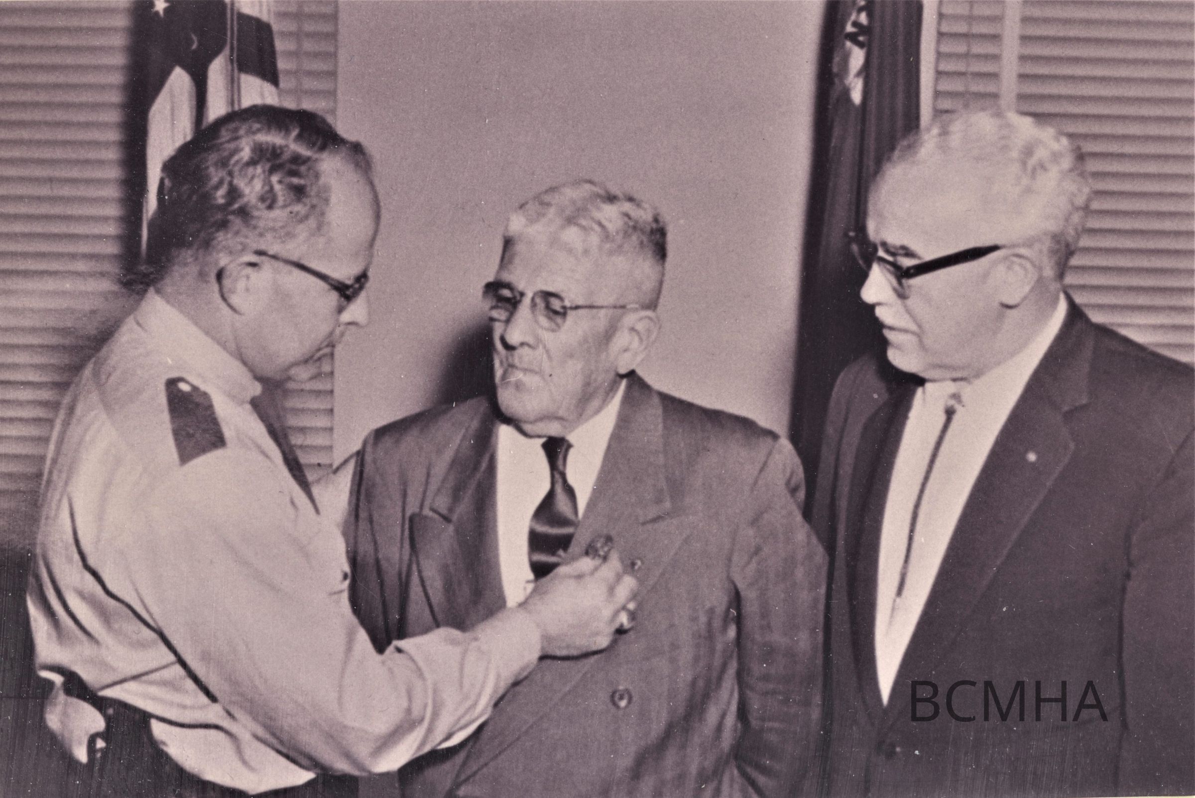 Retirement of Officer Radolphe "Rudy" LaCroix, c. 1952-58 [l-r: Capt. Floyd Jenne; Rudy LaCroix; Harold "Hal" Corbin, Boulder City Manager]Collection