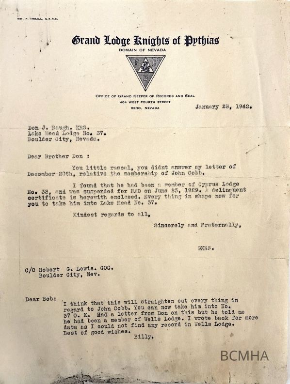 Robert [1900-1979] and Helen Lewis [1901-1985] came to Boulder City from Ruth, Nevada, in 1932. Lewis was a charter member of Boulder City's Knights of Pythias and the Lions Club. The house at 640 Avenue C, where they settled, is the last Six Companies house in Boulder City, nearly unchanged from its original construction.