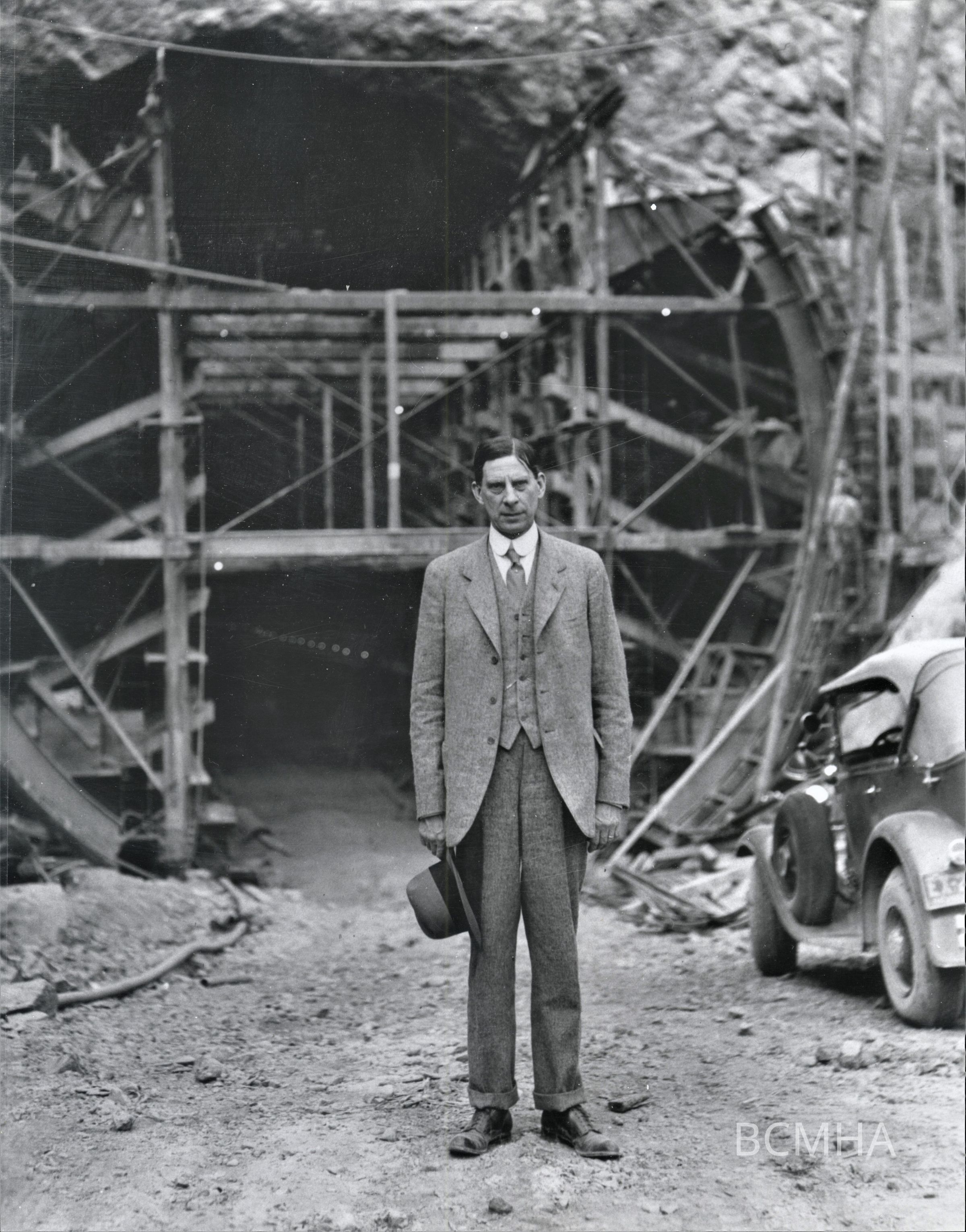 "Secretary of Interior, Dr. Ray Lyman Wilbur, under whose supervision the Boulder Canyon Project work commenced, in a tour of inspection, September 23, 1932. A view of the concrete form used in lining the 50 foot diversion tunnels at outlet portal of Diversion Tunnel No.2."; UNLS photo (LA 327 136 63, no. 21)Collection