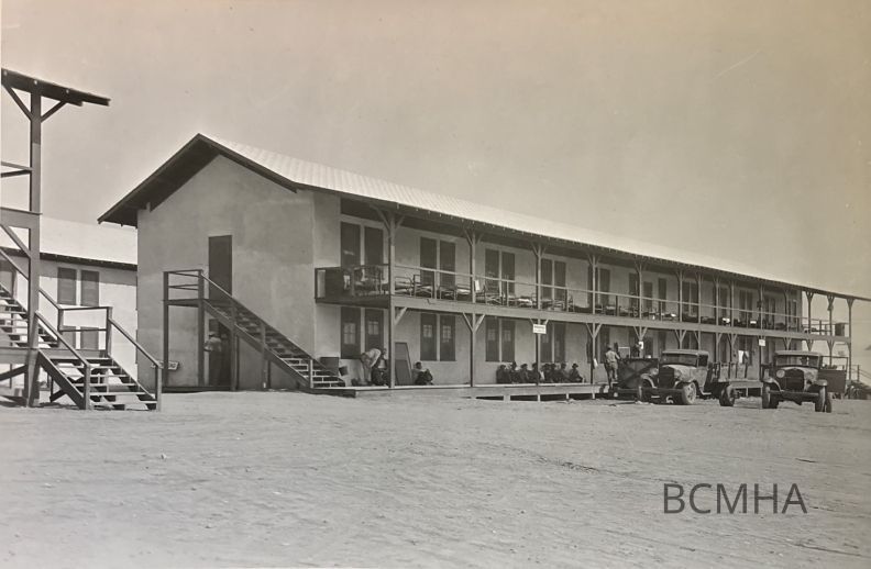 Boulder City; Six Co's. dormitory; c. 1931-32; note beds pulled out to the balcony to escape the heat; the sign reads, “Positively No Loafing”; desert water bags hang from the postsLexicon
