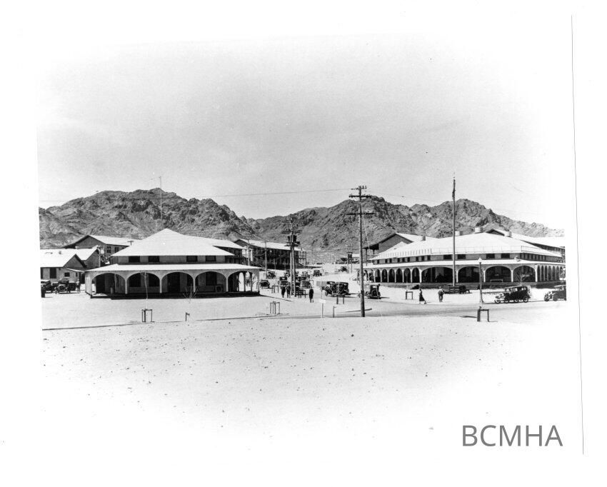 Boulder City; Six Co.'s; intersection of Cherry St. & Nevada Hwy; Boulder City Company office, left; recreation hall, right, with signs under constructionMade/Created
