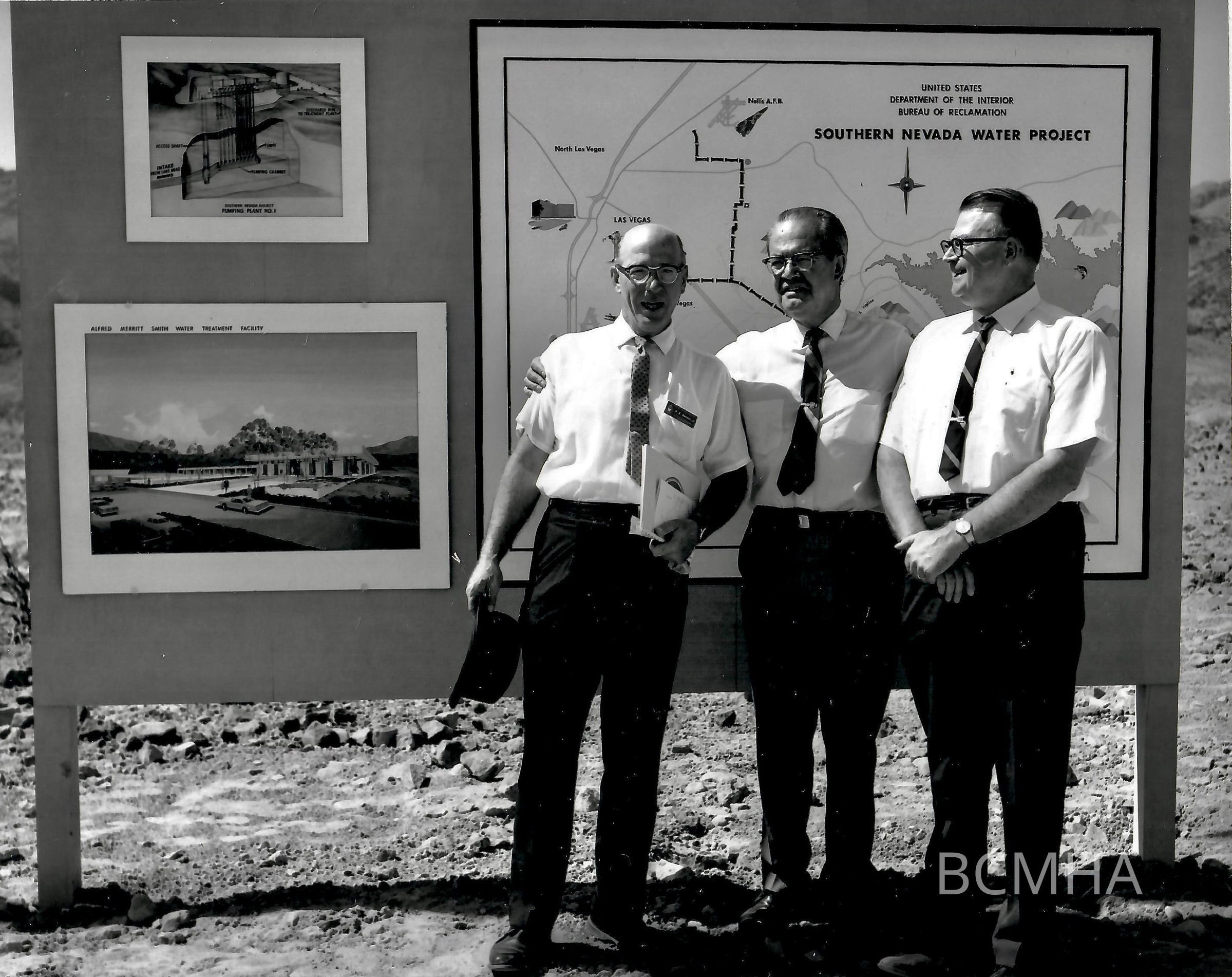 ![0002:3566: Southern Nevada Water Project - Groundbreaking Ceremony ["Principal participants in the groundbreaking ceremony for the Southern Nevada Water Project September 7, 1968, near Saddle Island on Lake Mead are shown here. From left, are Assistant Commissioner of Reclamation N. B. Bennett, Jr.; Master of Ceremonies, U. S. Senator Alan Bible; and Regional Director A. B. West of the Bureau of Reclamation's Region 3. Senator Bible delivered the principal address ad detonated an explosion at the inlet portal of River Mountain Tunnel."] 9-7-68 [USBR photo no. P952-300-8335 NA] [John L. Miles, photographer]](https://d8e7jbdw4fu0e.cloudfront.net/4452/81827ce0-c124-11ee-88df-edbffe37e4b5-vdT46fm.lg@2x.jpg)