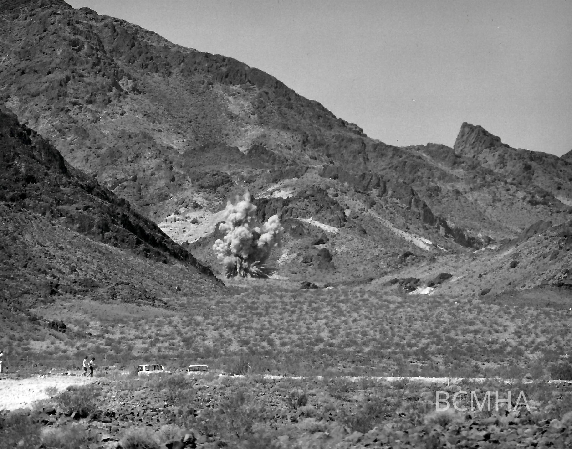Southern Nevada Water Project - Groundbreaking Ceremony ["Shown is the blast at the inlet portal of River Mountain Tunnel, which officially launched construction of the first stage of the $81 million Southern Nevada Water Project September 7, 1968. The blast was detonated by U. S. Senator Alan Bible from the speaker stand 1.7 miles away, where the groundbreaking ceremony was held."] 9-7-68; USBR photo no. P952-300-8334 NA; E. E. Hertzog, photographerCollection
