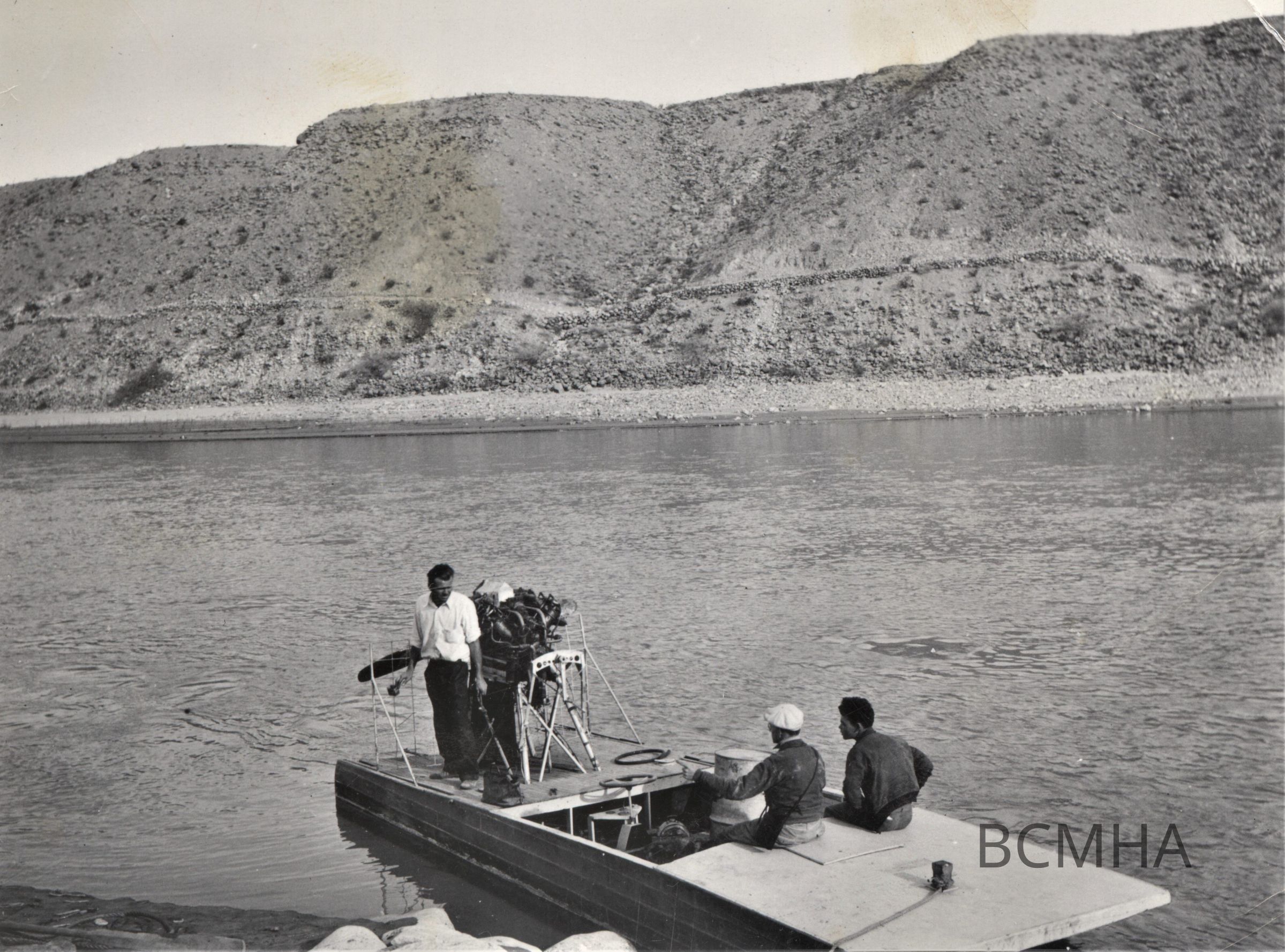 Colorado River - Murl Emery's airplane engine-powered flat boat, the Flying Fish. "The boat with Murl, Murphy, J.R. Woodruff. Look N. across river. Pierce Ferry on bottom lake geology job."; Murl Emery in white shirt; see MS 10Collection