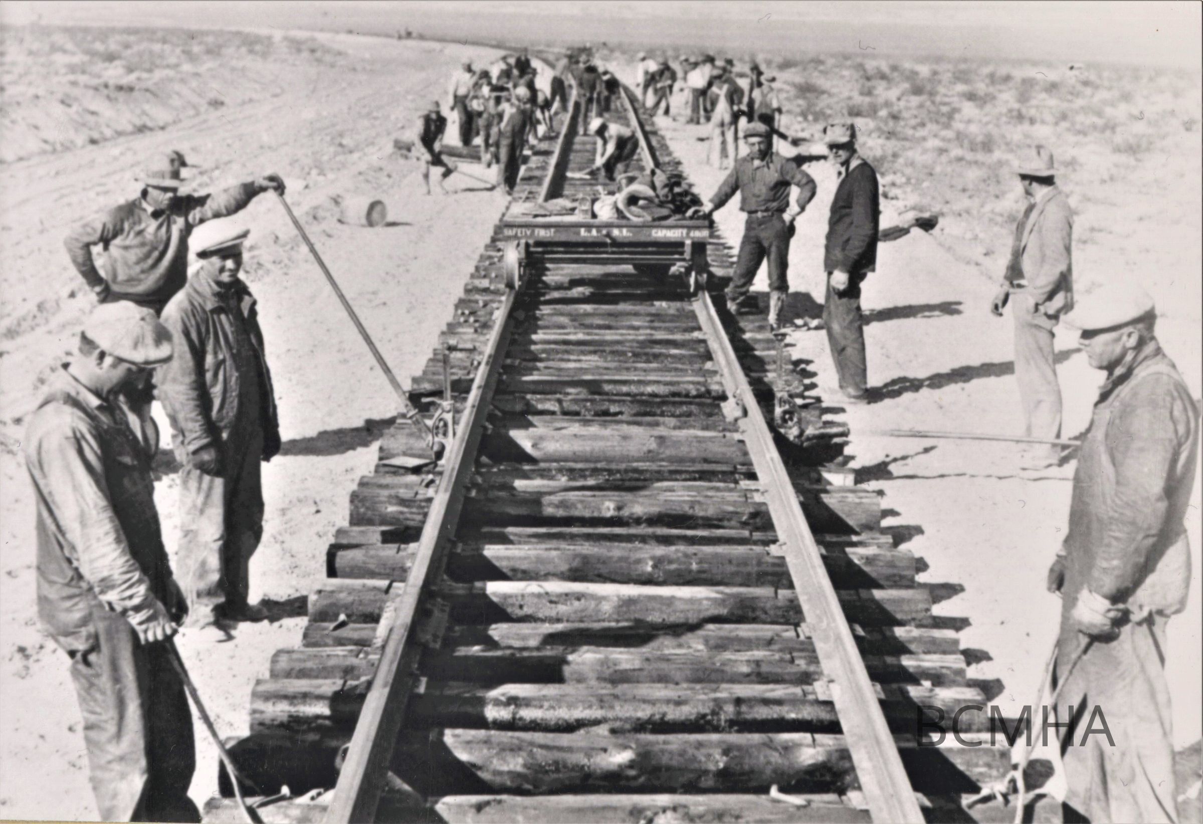 Union Pacific Railroad; Boulder City branch-line; under construction; c. October 1930; track workers; NSMHS photo no.1060Collection