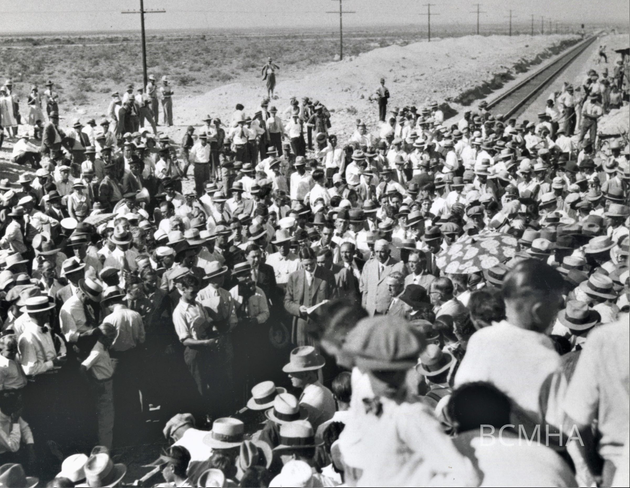 Union Pacific Railroad; Silver Spike Ceremony; to begin construction of the Boulder City branch-line; September 17, 1930; Interior Secretary Ray Lyman Wilbur; reading his speech; Boulder City Library; Graphic View of Hoover Dam; photo no. 3; W.A. Davis, photographerCollection