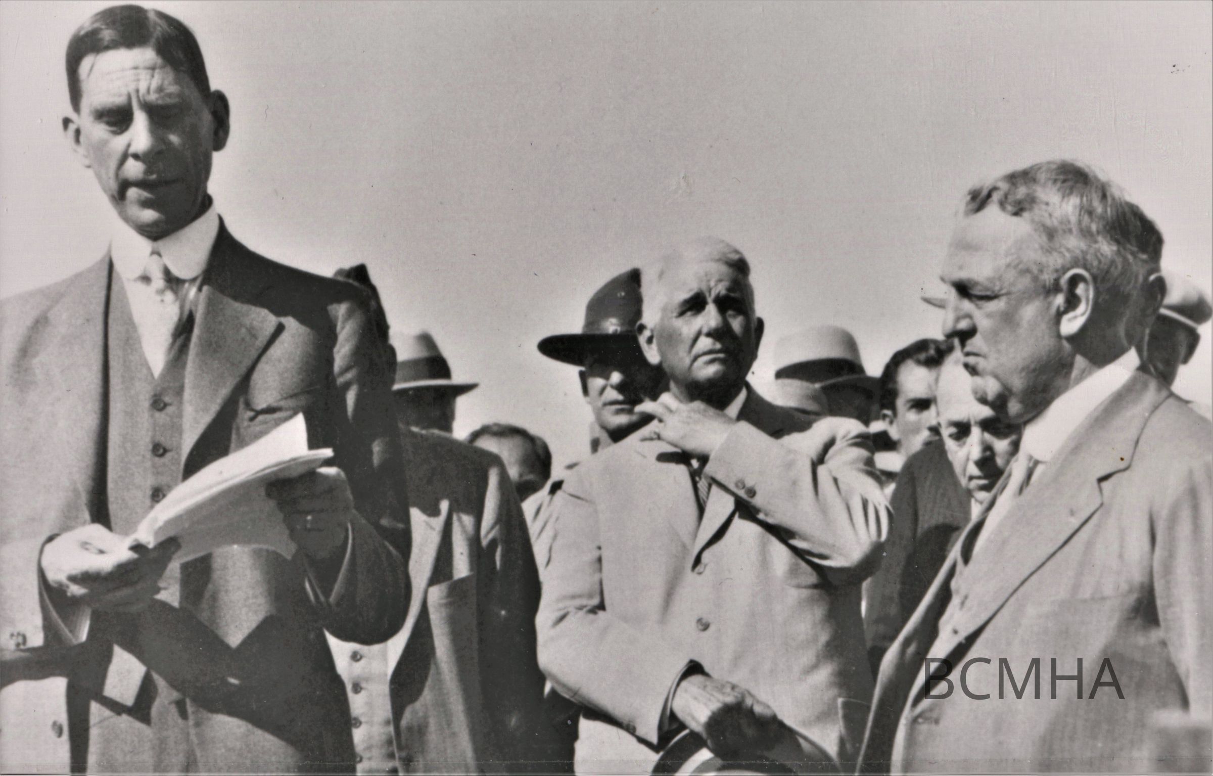 Union Pacific Railroad; Silver Spike Ceremony; to begin construction of the Boulder City branch-line; September 17, 1930; l-r: Ray Lyman Wilbur, Secretary of the Interior; Carl R. Gray, Union Pacific Railroad; ?