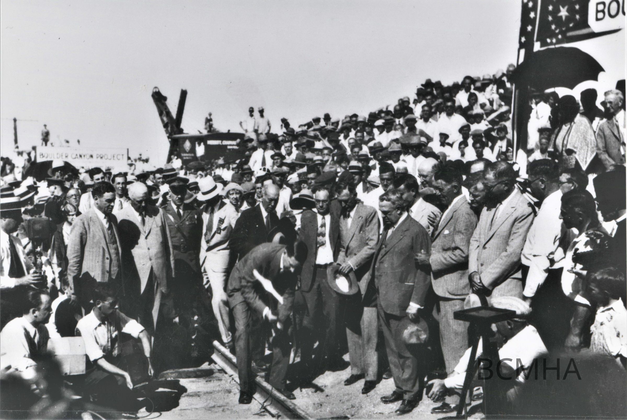 Union Pacific Railroad; Silver Spike Ceremony; to begin construction of the Boulder City branch-line; September 17, 1930; Interior Secretary Ray Lyman Wilbur drives the spike;