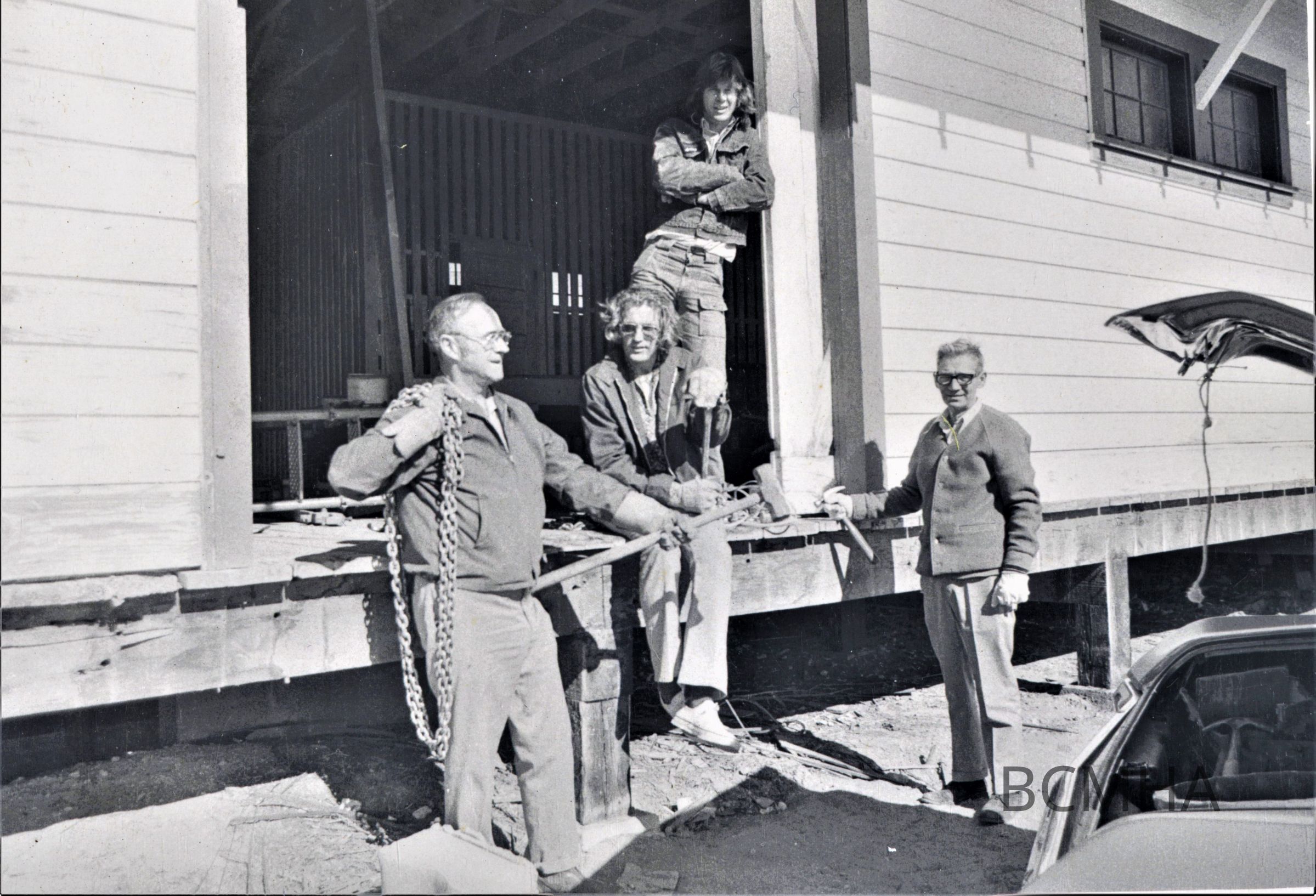 Union Pacific Railroad station being moved out of Boulder City to the grounds of the Clark County Museum [aka the Southern Nevada Museum], March 6, 1974 (dedicated July 24, 1976) [l-r: George Stafford; Roy Purcell, museum curator; Harvey Pearson; Jess Bachman, museum board member.]; Boulder City News, July 22, 1976, p.17Collection