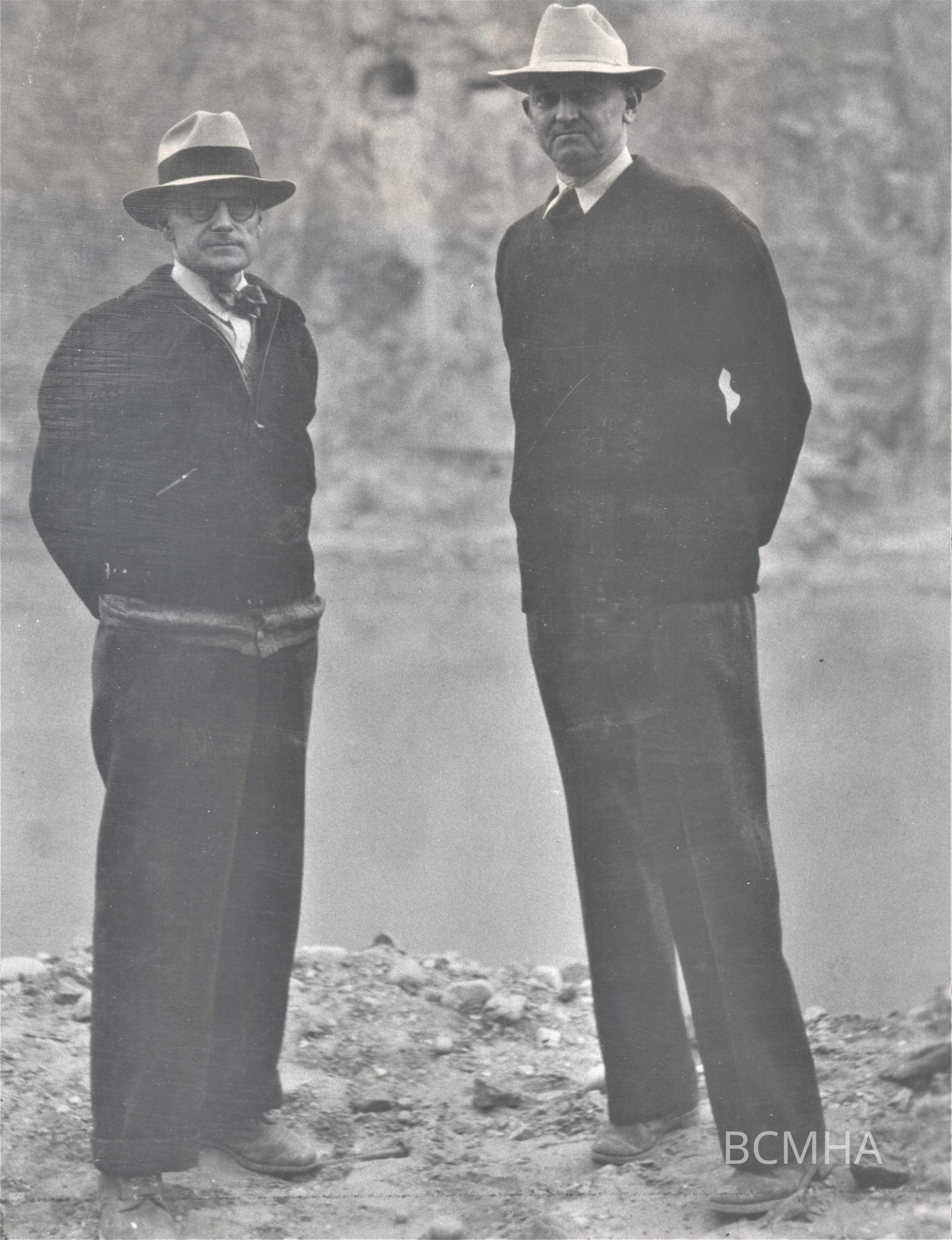 l-r: Walker R. Young, Boulder Canyon Project construction engineer; Frank T. Crowe, Six Cos. general superintendent, February 1, 1935 [USBR photo (Wash no 2842), Bernard "Ben" D. Glaha, photographer]Collection