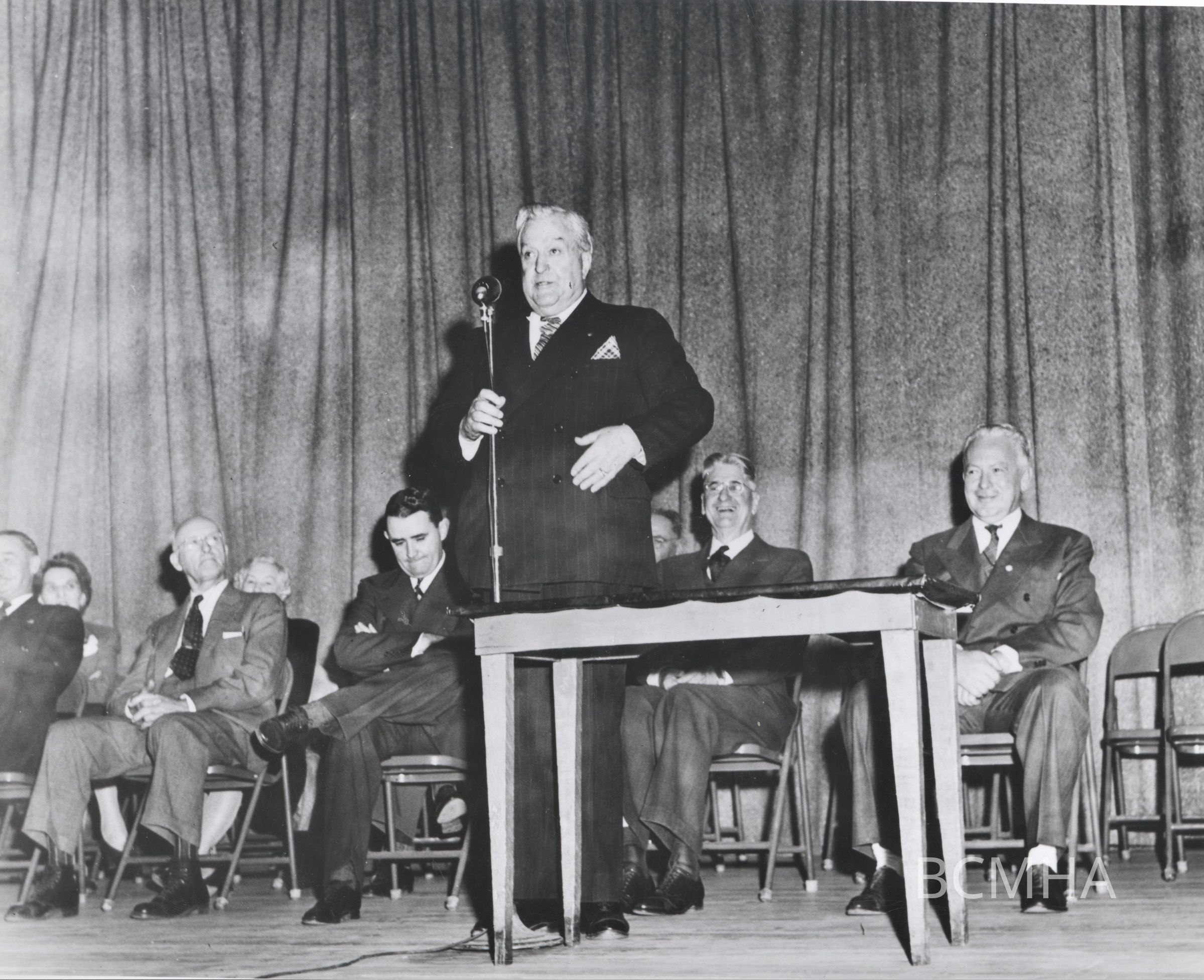 Jack Higgins; Pearl Brown; James Downs; Mrs. Hickey; Berkeley Bunker; NV. Senator Patrick McCarran, speaking; Ed W. Clark; Hap Hazard; UNLS photo: Ed W. Clark CollectionCollection