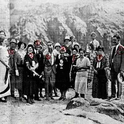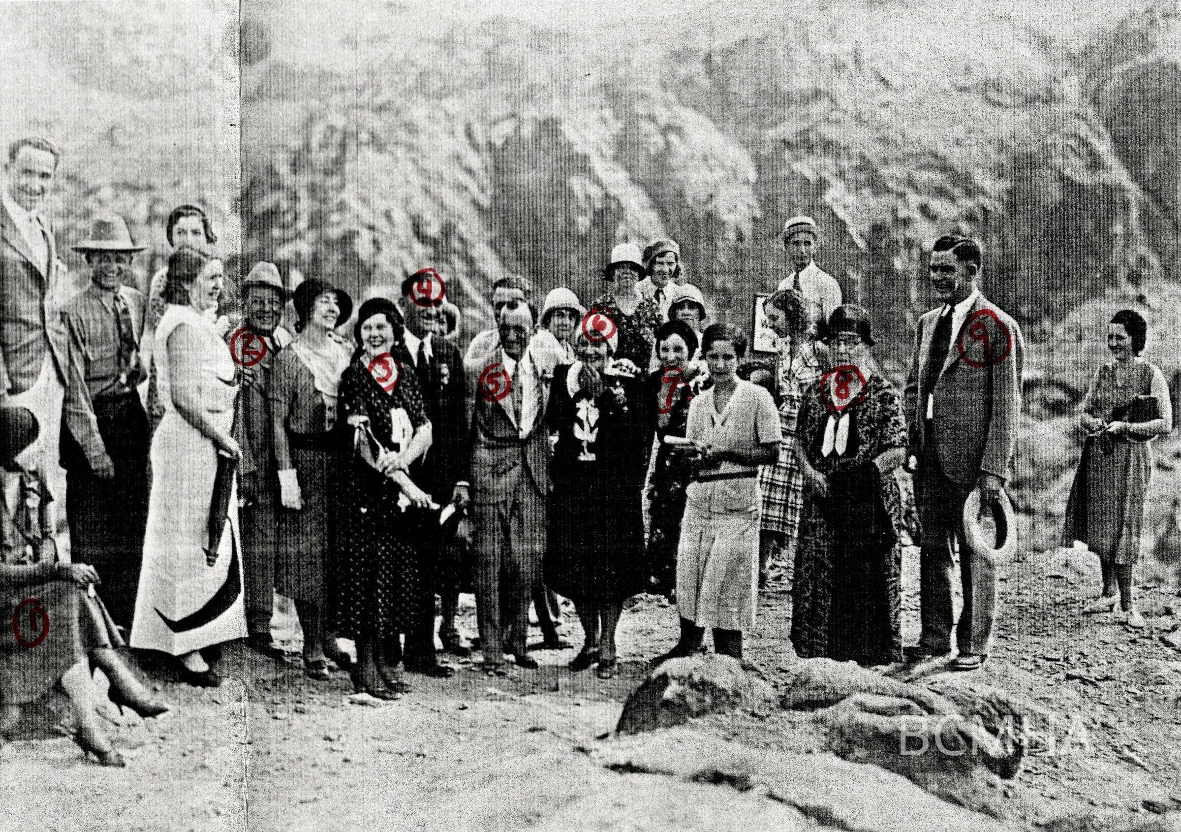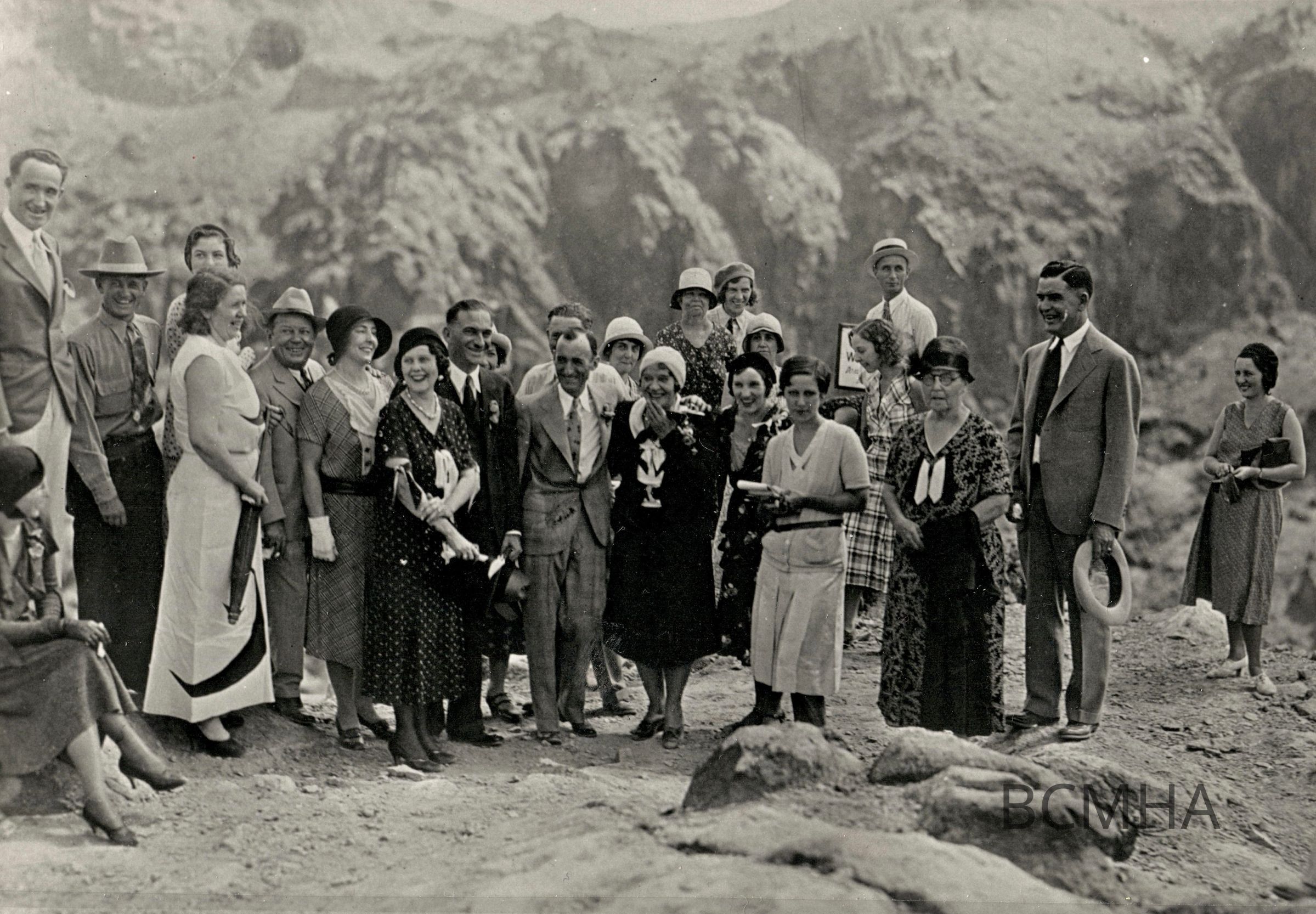 Wedding of Minnie "Ma" Kennedy and G. E. [Guy Edward] "Whataman" Hudson at Hoover Dam, September 19, 1931 [12:25 p.m.]; identifications 0002:1819a below: 1. Alta Ham; 2. Harley Harmon; 3. Ceely Cragin?; 4. Art Ham, Sr.; 5. Guy Edward "Whitman" Hudson; 6. Minnie "Ma" Kennedy; 7. Myrtle Taylor?; 8. Delphine Squires; 9. Ernie Cragin; UNLS - Doktor Collection 0012:0143Collection