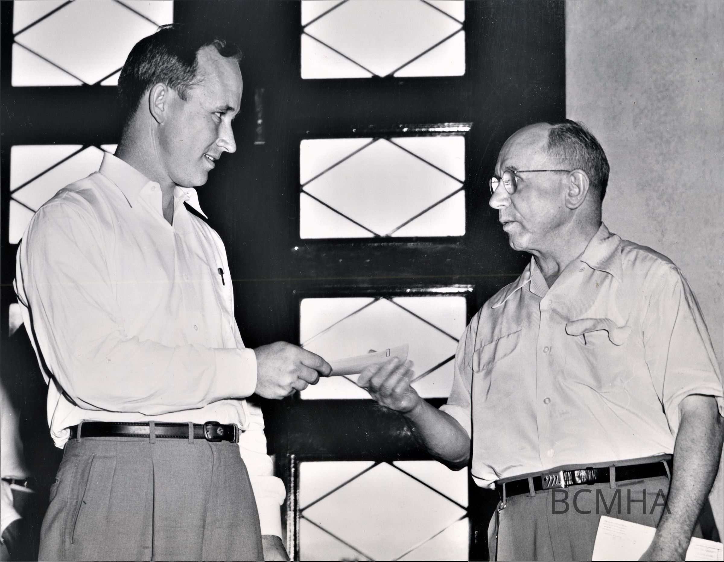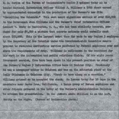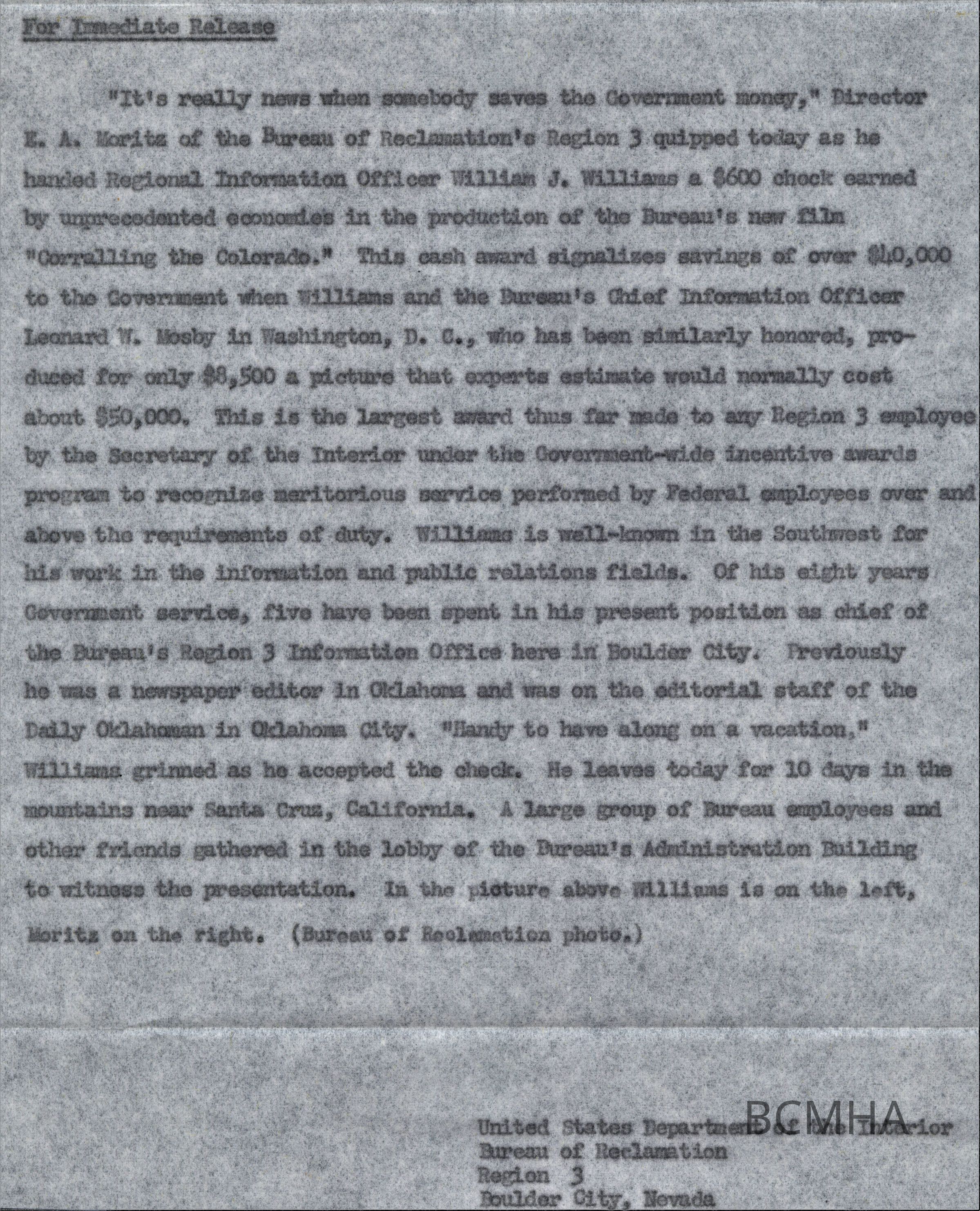 William J "Bill" Williams, U.S. Bureau of Reclamation Region 3 Public Information Officer receives a check for $600 from Regional Director Ernie A. Moritz, c. 1950. Williams facilitated production of the film Corralling the Colorado for $8,500 rather than the $50,000 estimated. [gout. press release behind photo- see below]