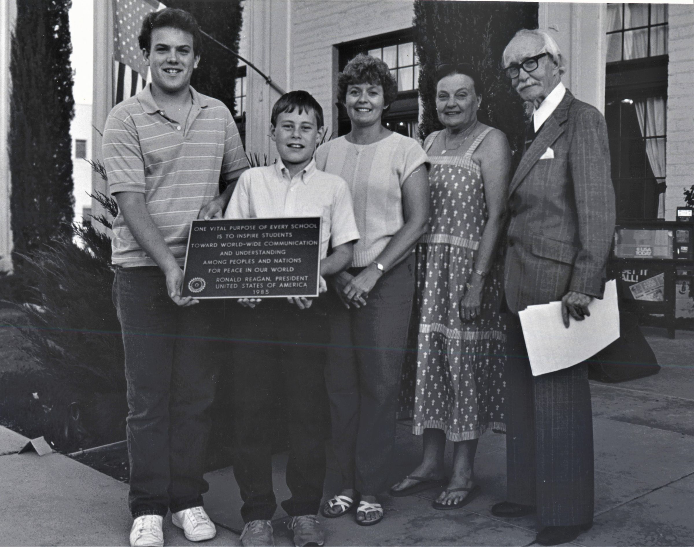 World Peace Plaque winners posed at the Boulder Dam Hotel October 1985; Boulder City News, October 10, 1985; -r: Mike Madsen; Ewald Hueffmeier; Candice Kelley; Pat Crowe Lee [daughter of Frank Crowe]; Elton GarrettCollection