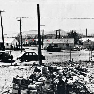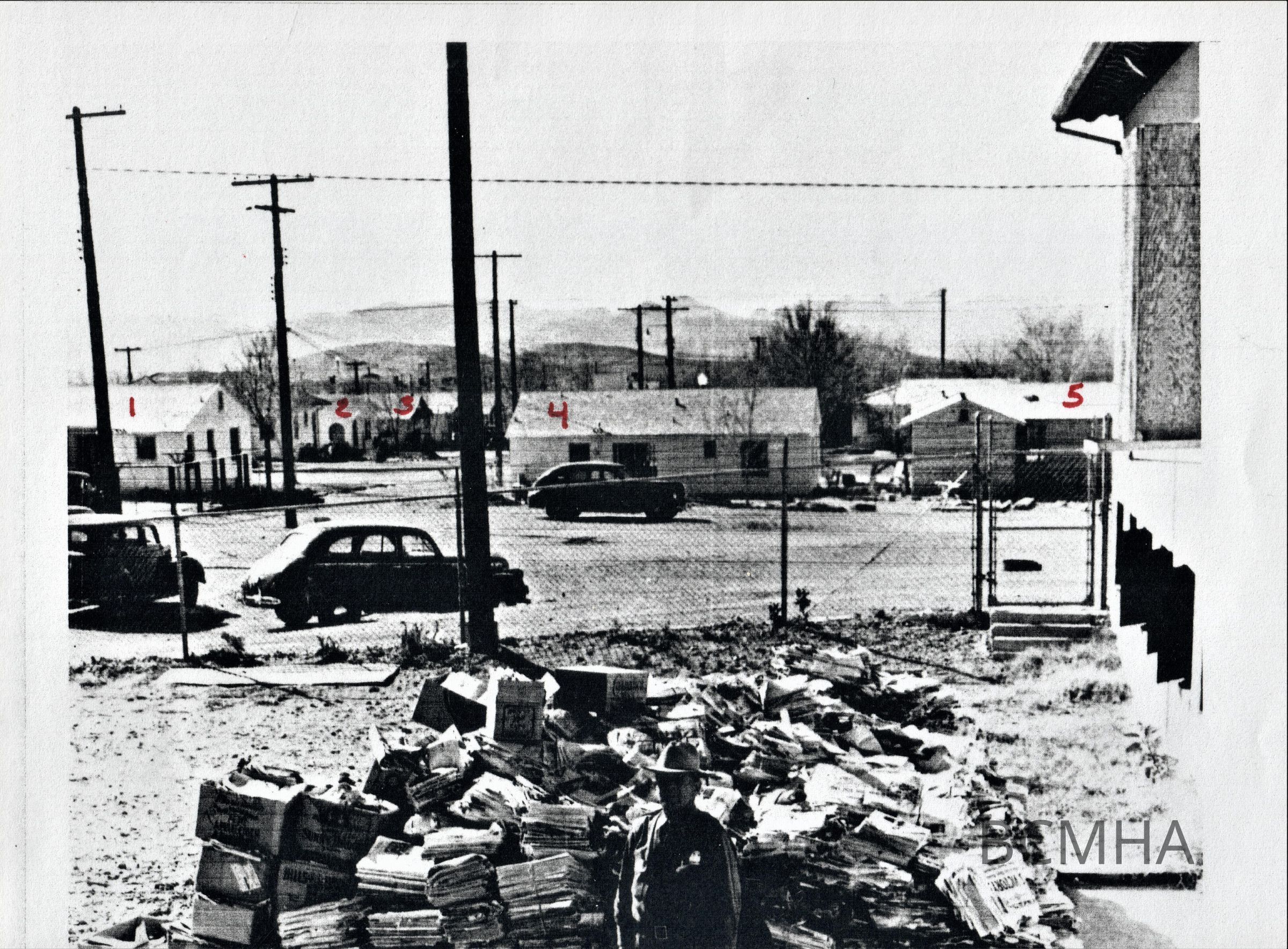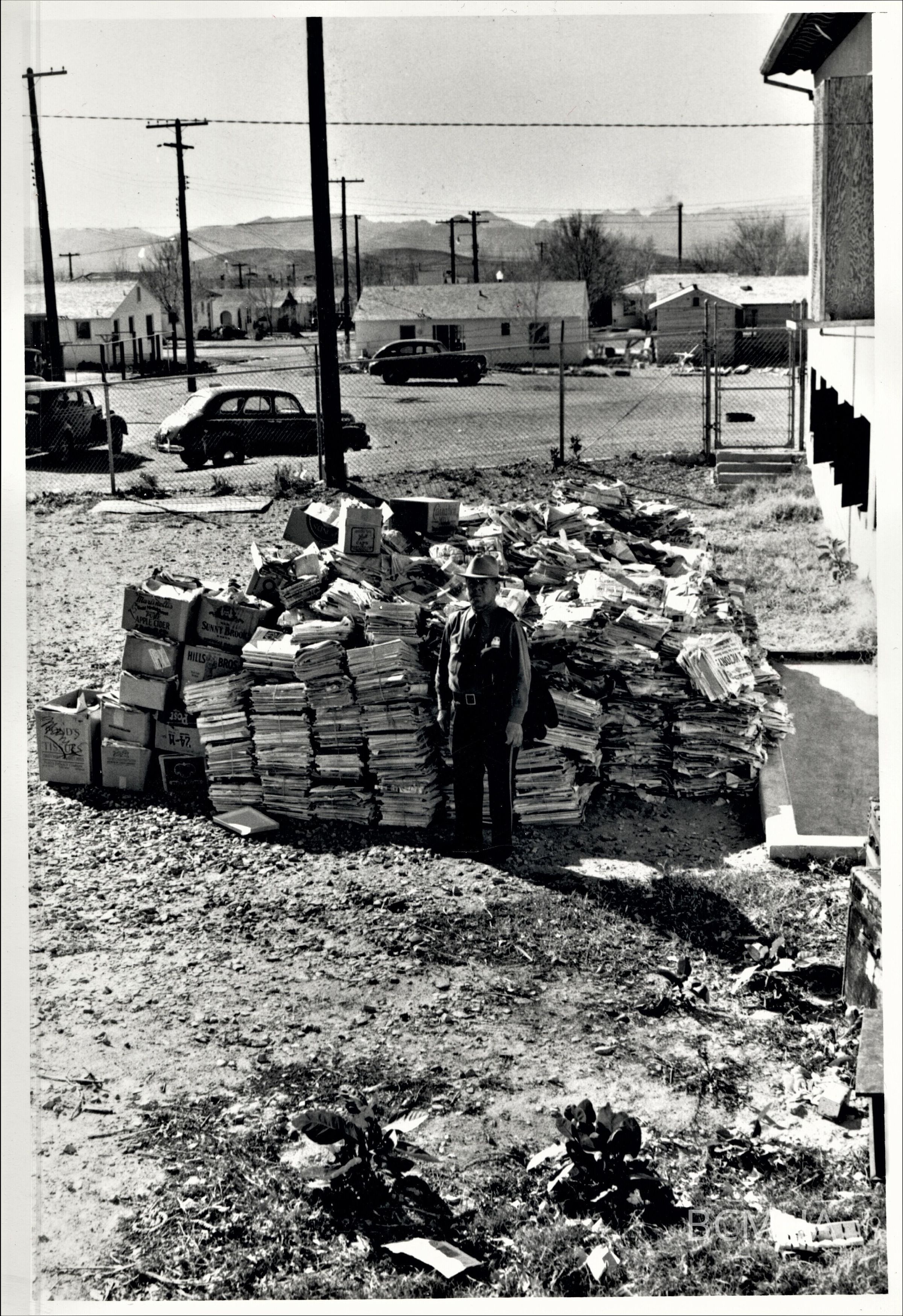 "Ranger Rudy La Croix and pile of waste paper collected in Boulder City, March 7, 1942."; Houses addresses see 0002:2308a: 1. 912 Wyoming St.; 2. 603 Avenue F; 3. 607 Avenue F; 4. 1016 Wyoming Street; 5. 1020 Wyoming StreetMade/Created