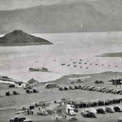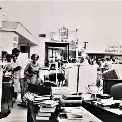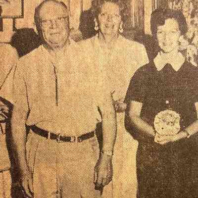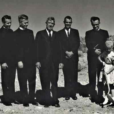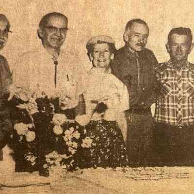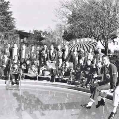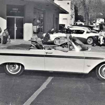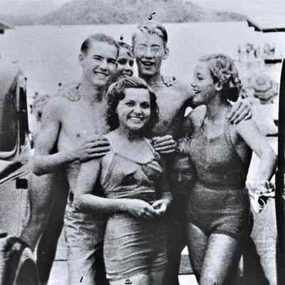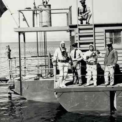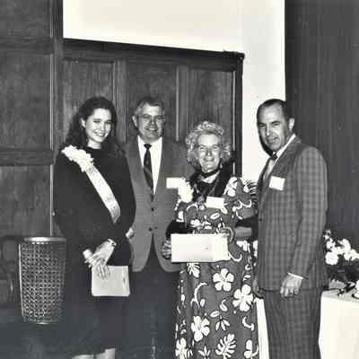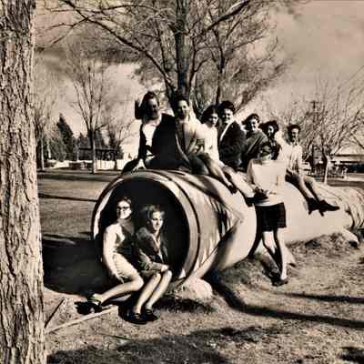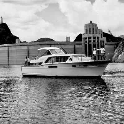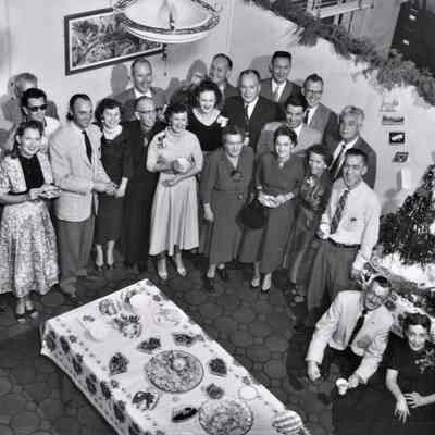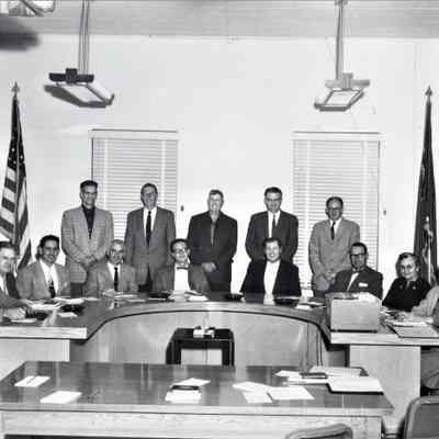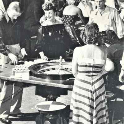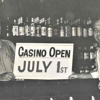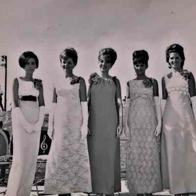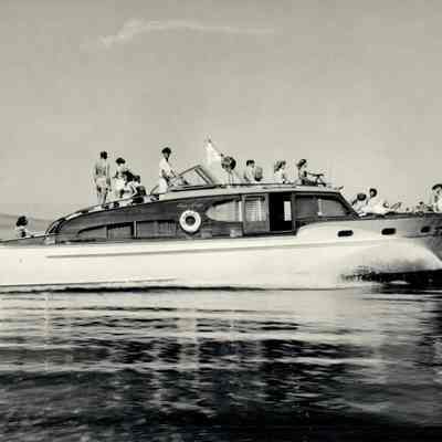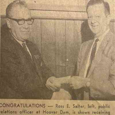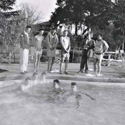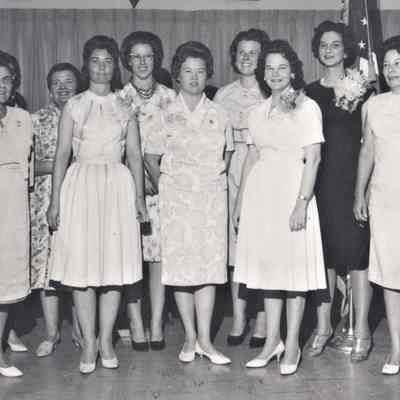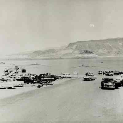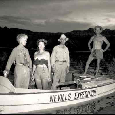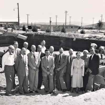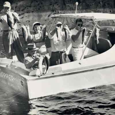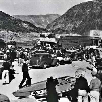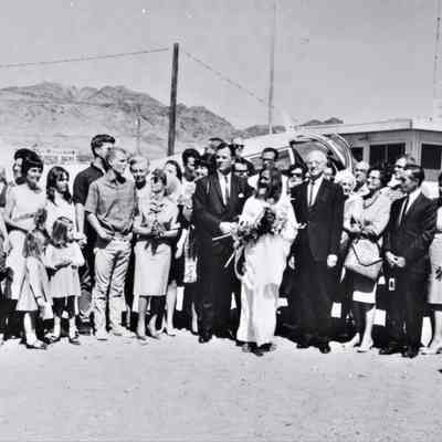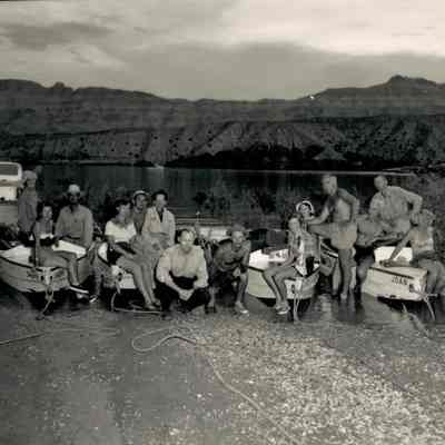 l-r: Bob Glinski; Elton Garrett; Jackie Brown & Hal Brown Boulder Dam Hotel owners; Dan Steelman Commodore of the Lake Mead Yacht Club front, l-r: Ann Underhill; Robin Killinger Queen of the 53rd Annual Gold Cup Race, Lake Mead. 1960